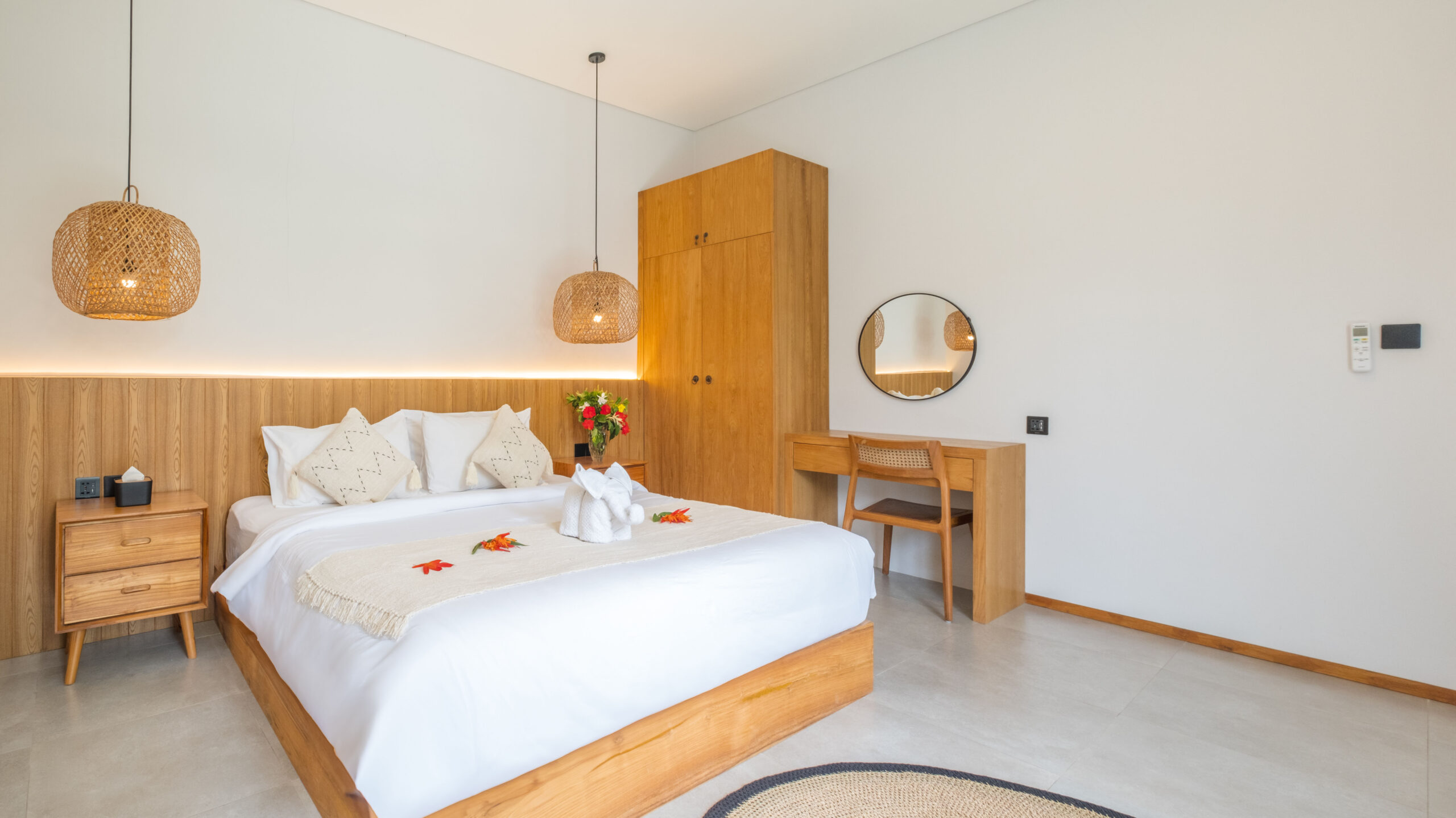The villa features two spacious bedrooms, each showcasing contemporary elegance with natural wood accents and soothing earth tones. The plush king-sized beds ensure restful nights. Ensuring utmost comfort, both bedrooms include sleek ensuite bathrooms featuring opulent bathtubs and rain showers.