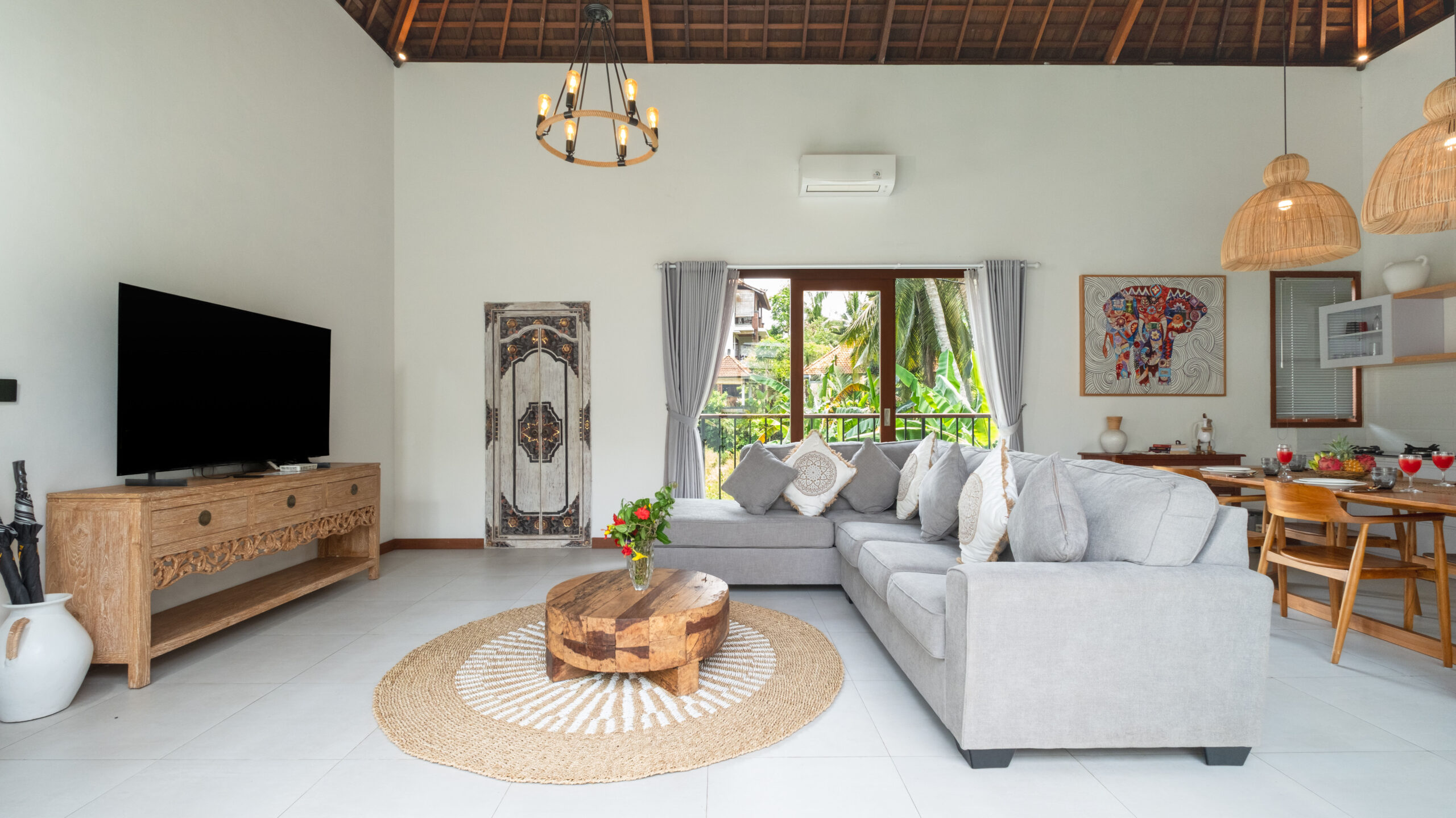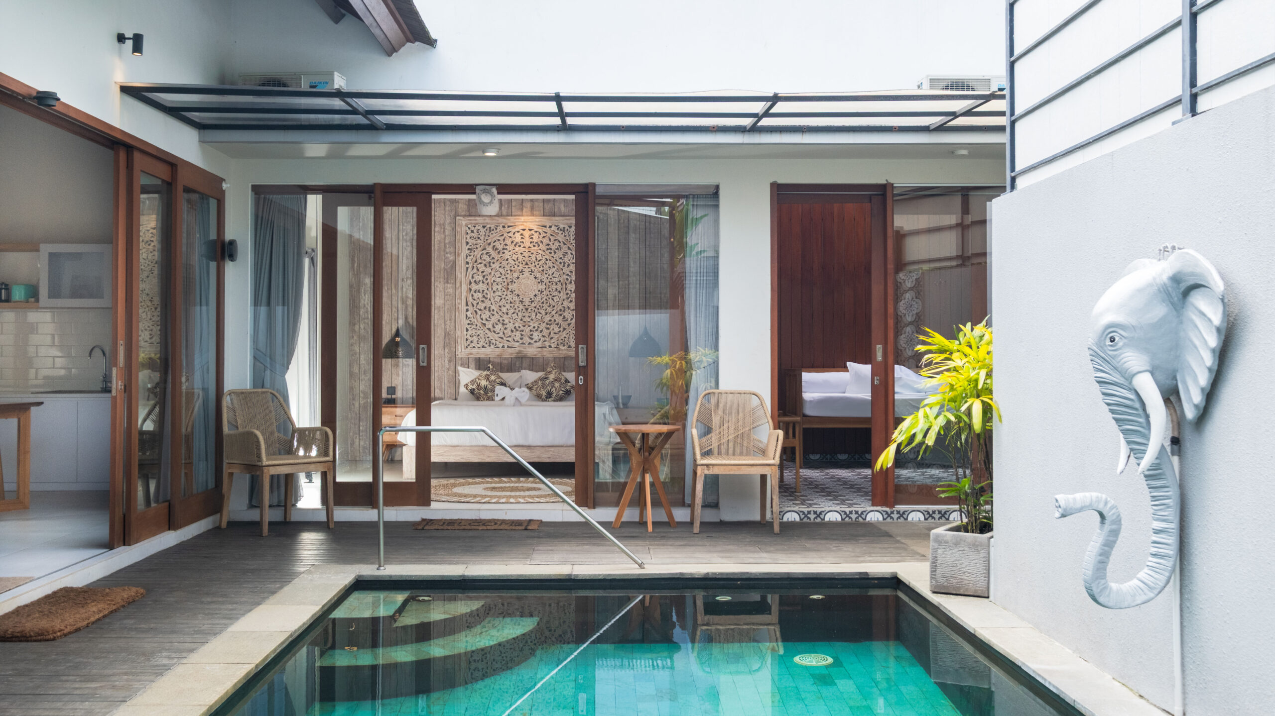 Elephant Villa 5 is a tranquil 2-bedroom retreat located in Central Ubud. Blending modern style with tropical charm, the villa features comfortable ensuite bedrooms with natural wood accents, air-conditioning, and large windows that invite natural light. The private outdoor pool offers a perfect spot for relaxation and refreshment. Inside, the open-plan living area includes a cozy lounge, a fully equipped kitchen, and tasteful décor. The living area can also be air-conditioned to suit your needs. With personalized services, including housekeeping and concierge assistance, the villa is an ideal choice for family holidays, just moments away from Ubud’s attractions and dining options