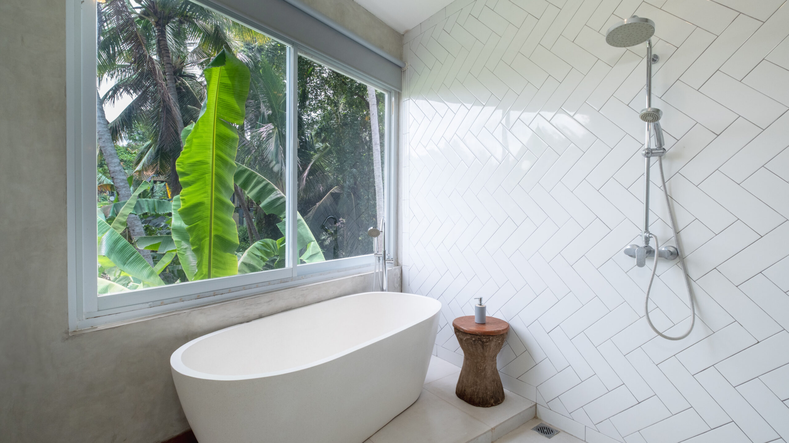 The villa offers two cozy ensuite bedrooms with natural wood furnishings, perfect for a peaceful stay. Both rooms are air-conditioned and feature large windows that let in natural light. With a spacious layout and comfortable bedding, you’re guaranteed a restful sleep. The bathrooms include both a rain shower and a bathtub. One bedroom also has a small office attached, providing a quiet space for work, which can easily be converted into an extra bedroom with the addition of a bed
