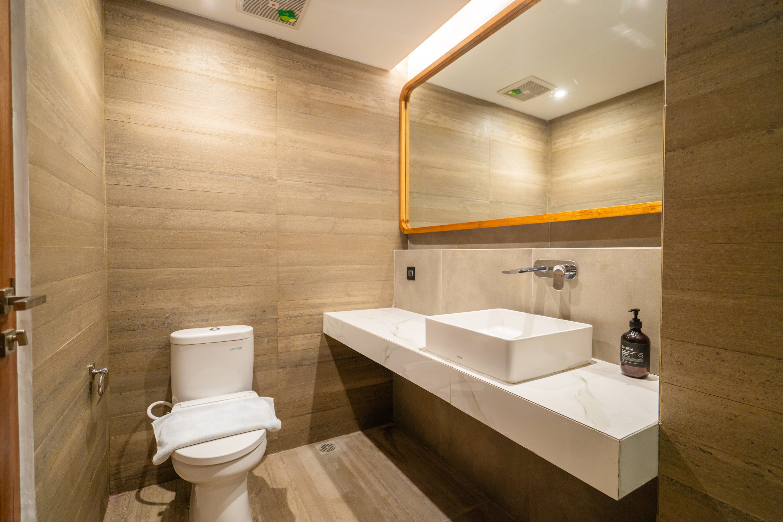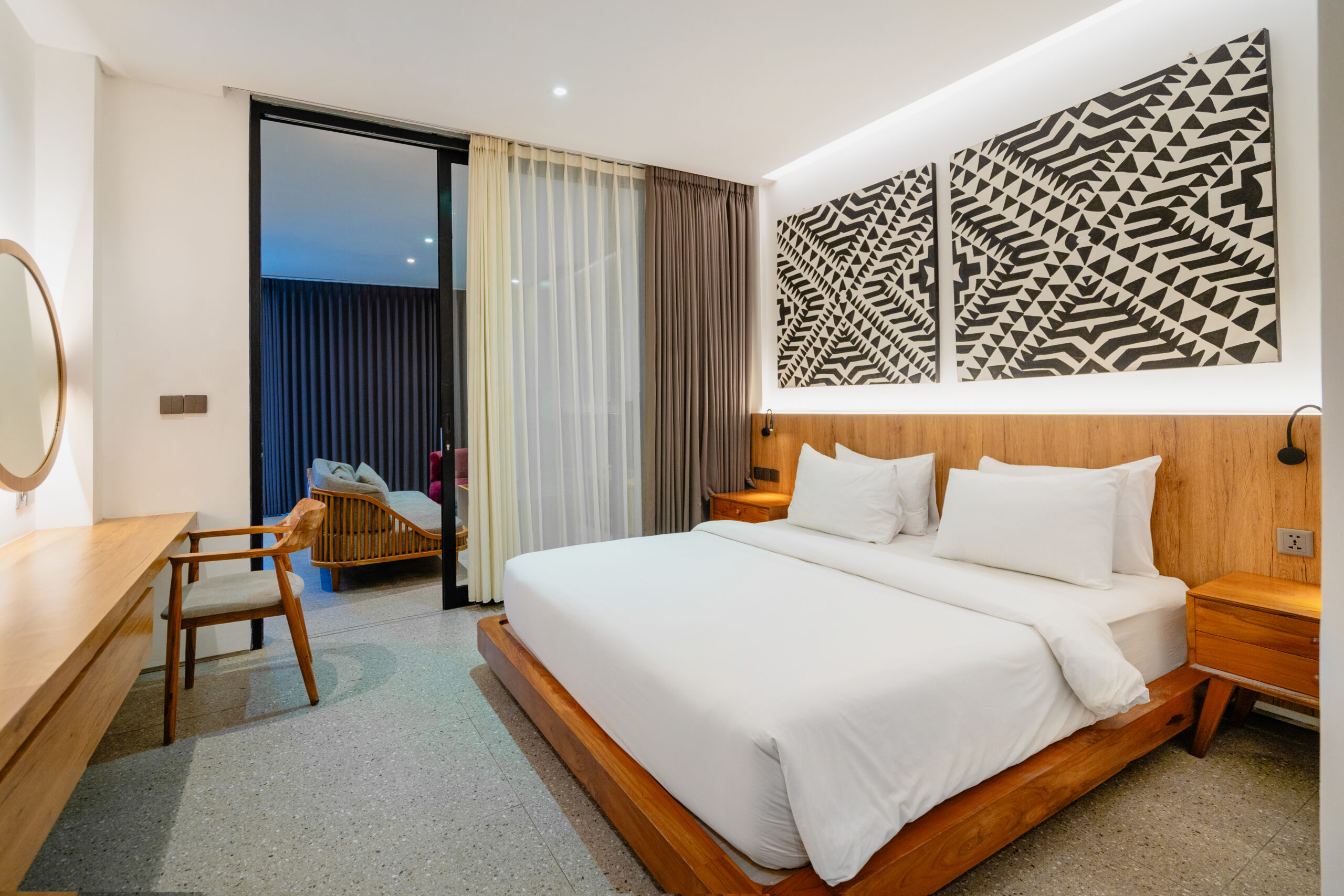 Step into a thoughtfully designed pavilion that blends contem- porary aesthetics with natural materials to create a calm and in- viting retreat. This spacious unit features an elegant bedroom with a minimalist wooden bed frame, soft white linens, and am- bient lighting, offering a restful sanctuary.