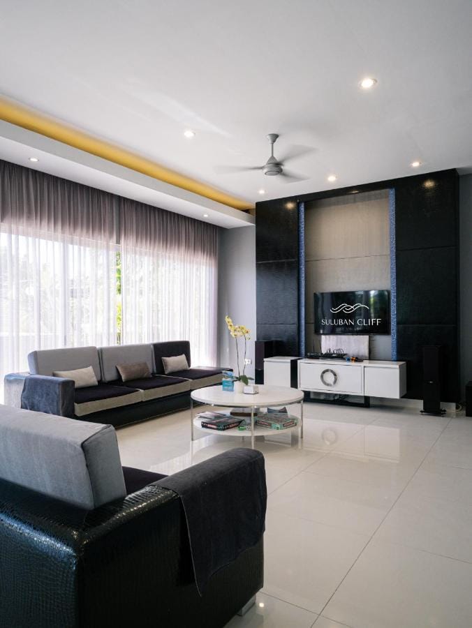 The villa features a spacious outdoor swimming pool surrounded by lush gardens, providing a serene oasis for relaxation. Whether lounging by the pool or enjoying the terrace with stunning ocean views, Suluban Cliff offers endless moments of tranquility. The shared lounge and kitchen areas make it ideal for family gatherings or vacations with friends.