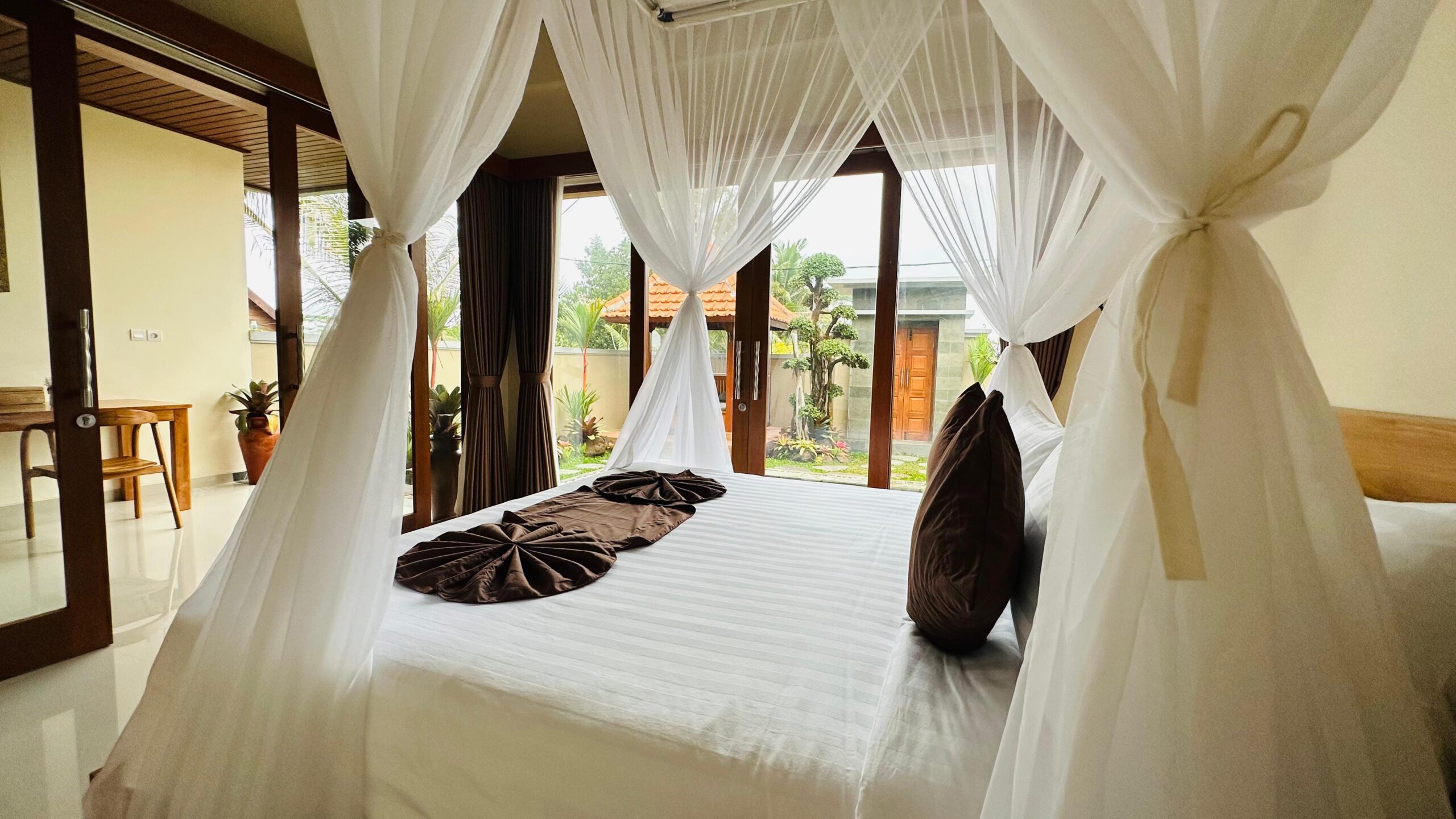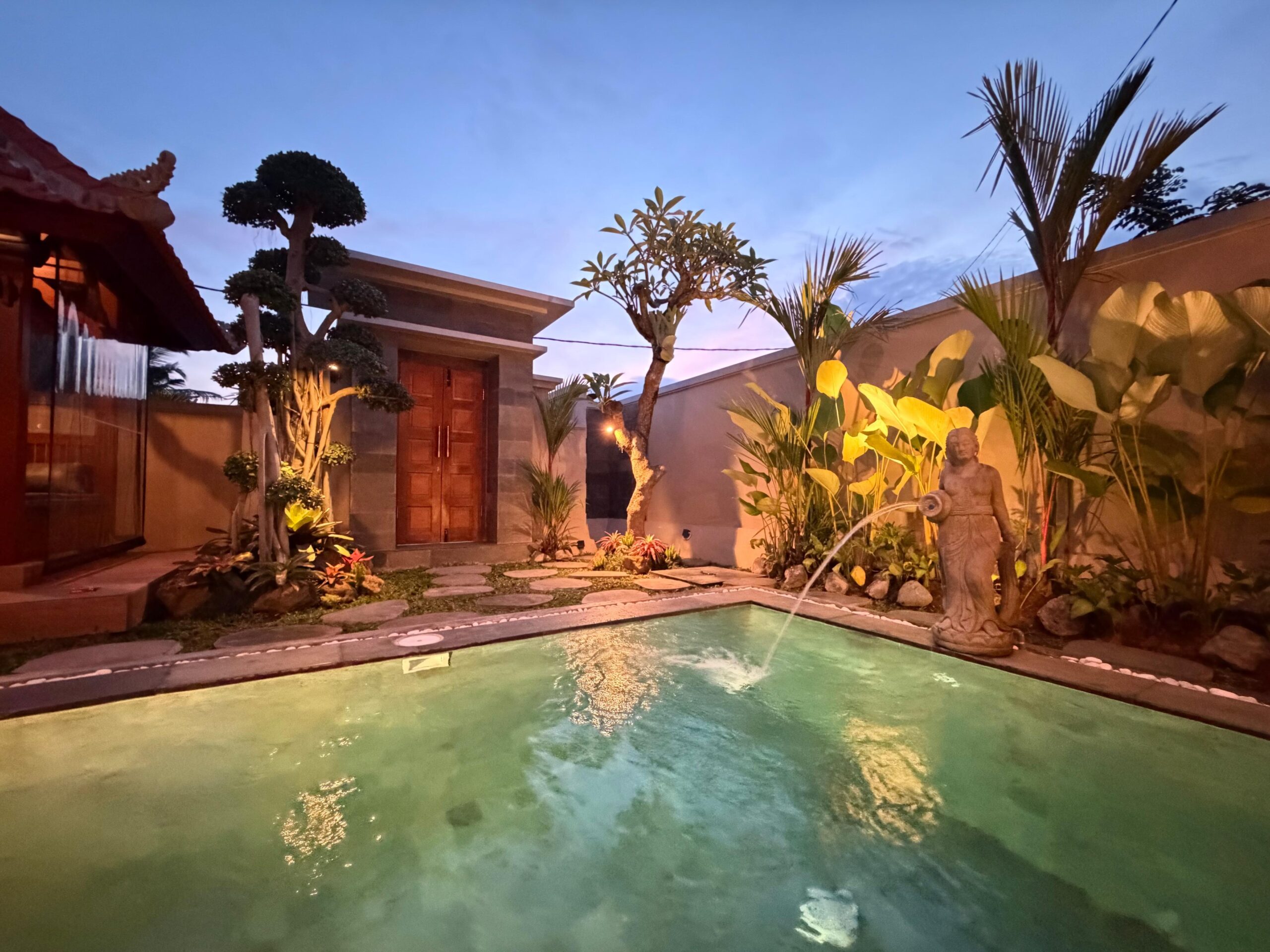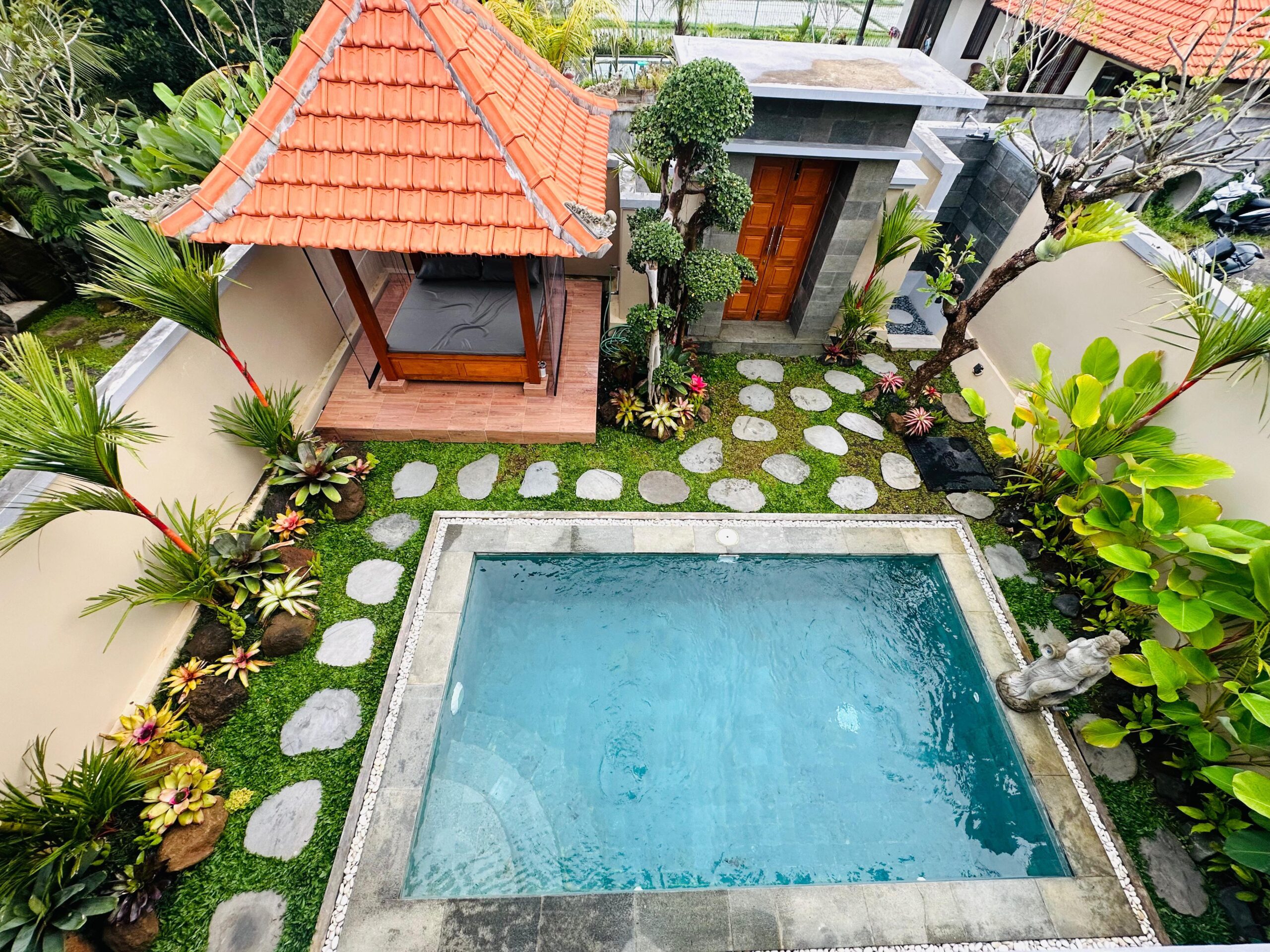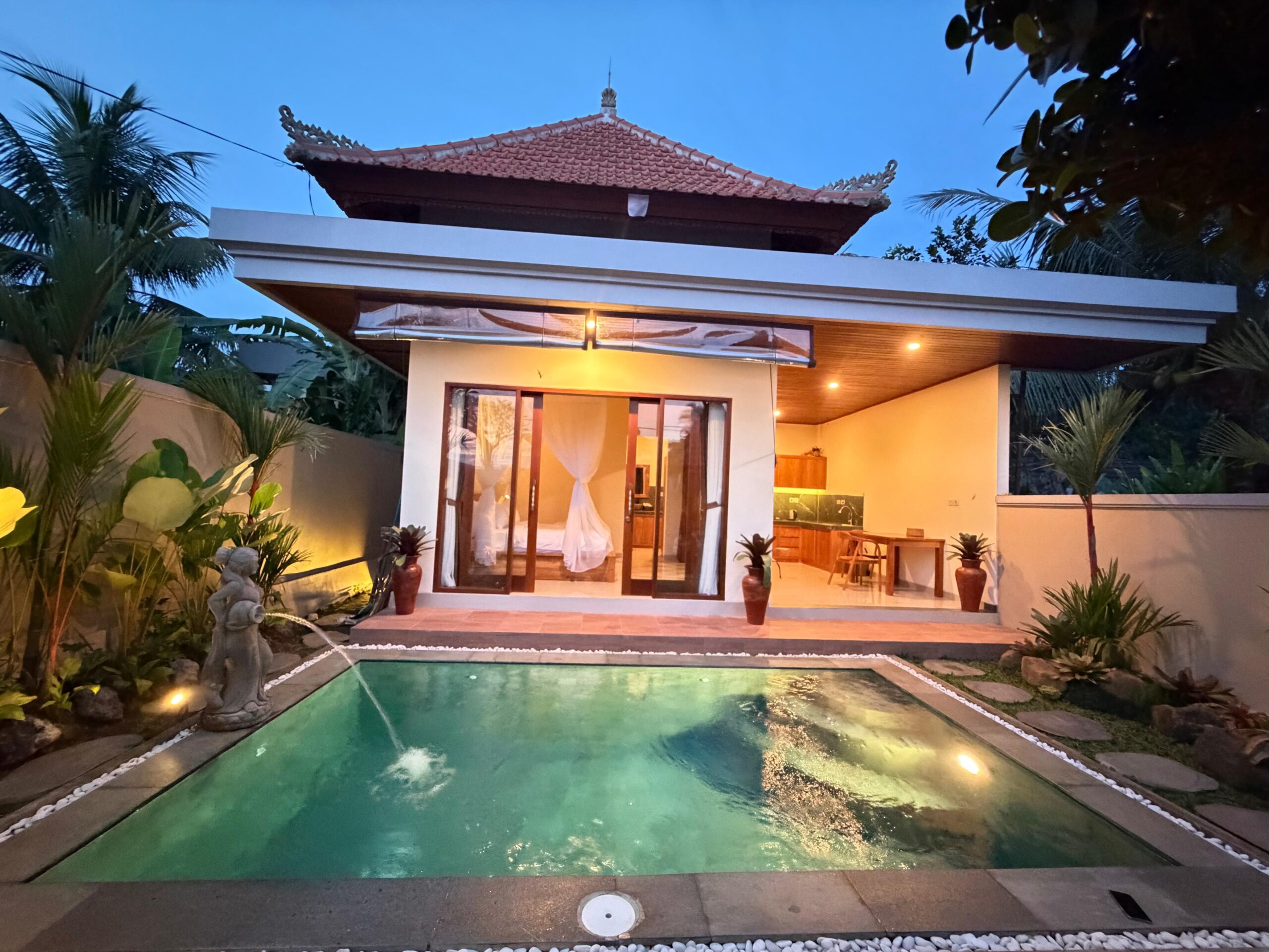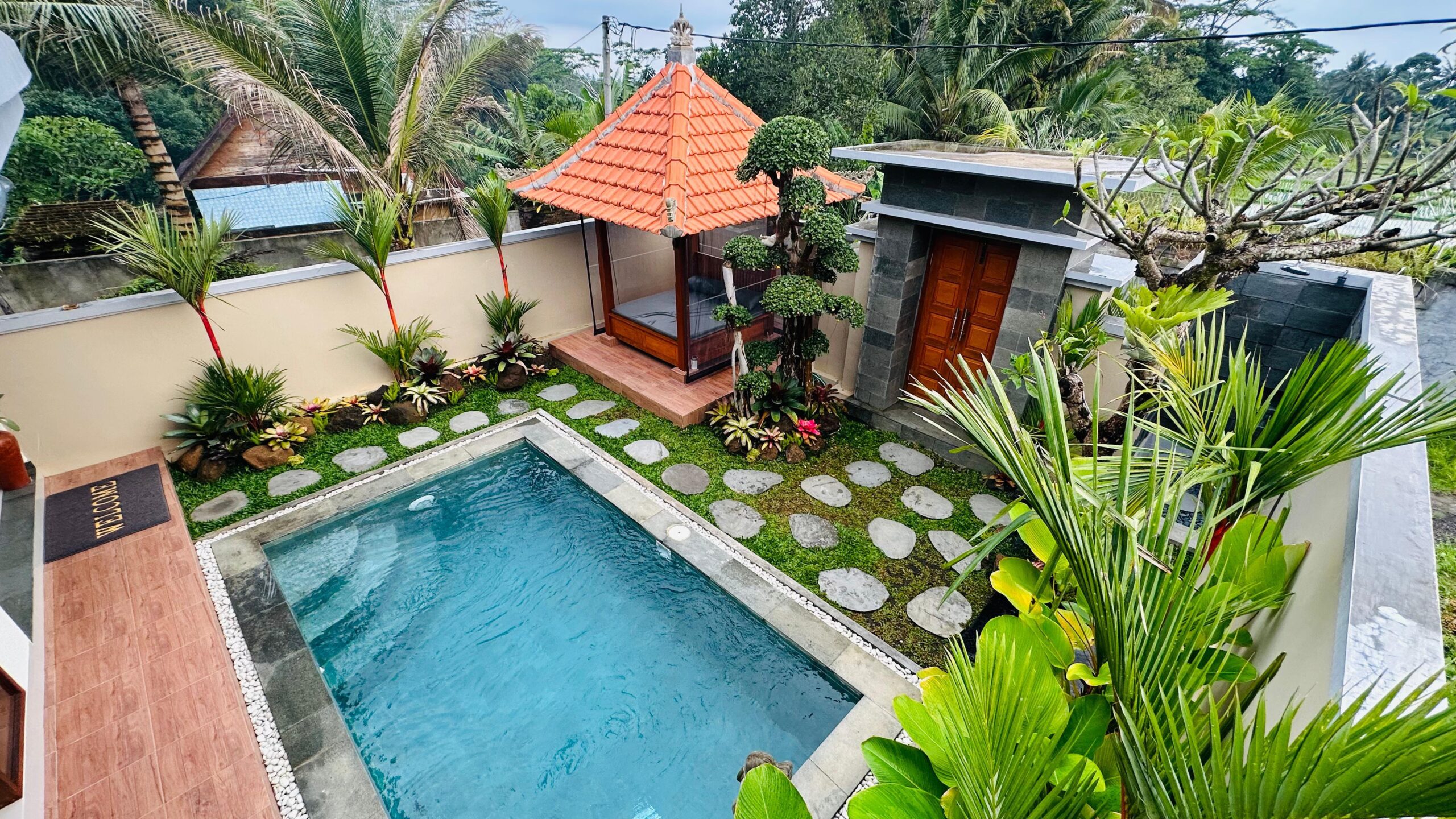 Welcome to Villa Uma Sari, a private one-bedroom villa in peaceful Tampaksiring, Bali. Perfect for a quiet escape, the villa features a cozy bedroom with a queen bed, AC, wardrobe, and desk. The en-suite bathroom includes a shower, bathtub, and hot water. Enjoy a private open kitchen and dining area, plus a pool with gazebo. Located near rice fields, it’s ideal for relaxing stays, nature walks, and a serene Bali experience.