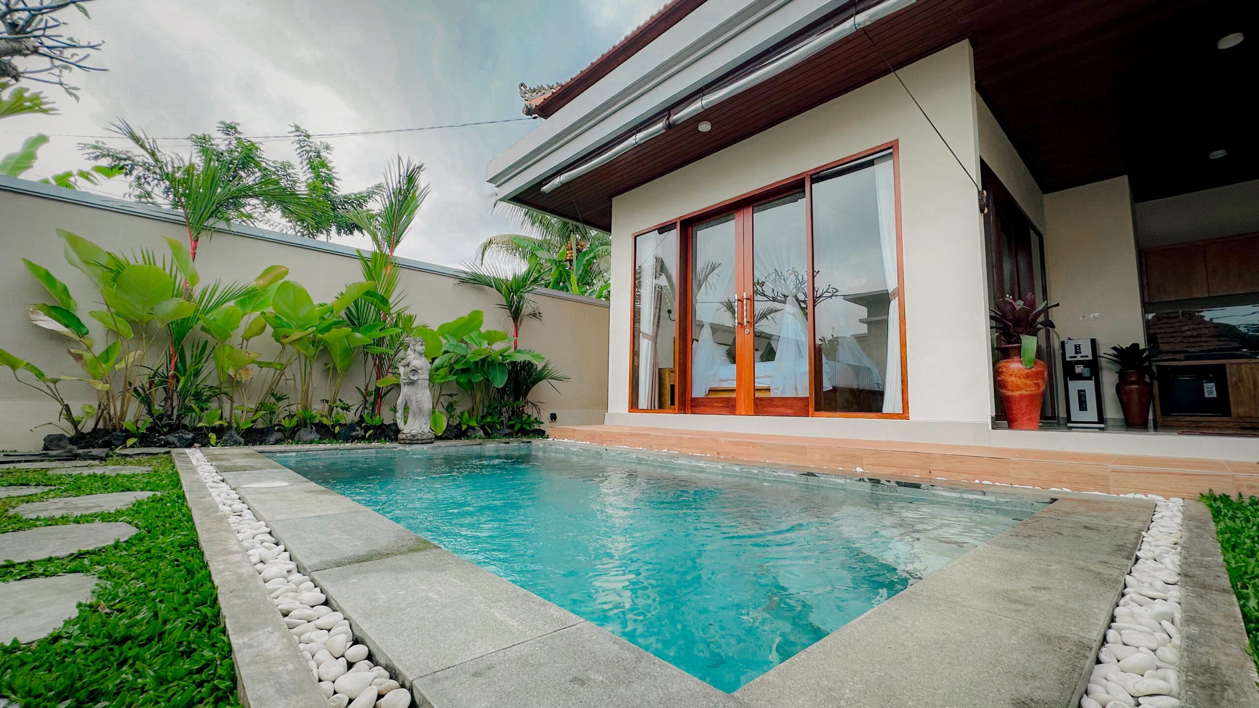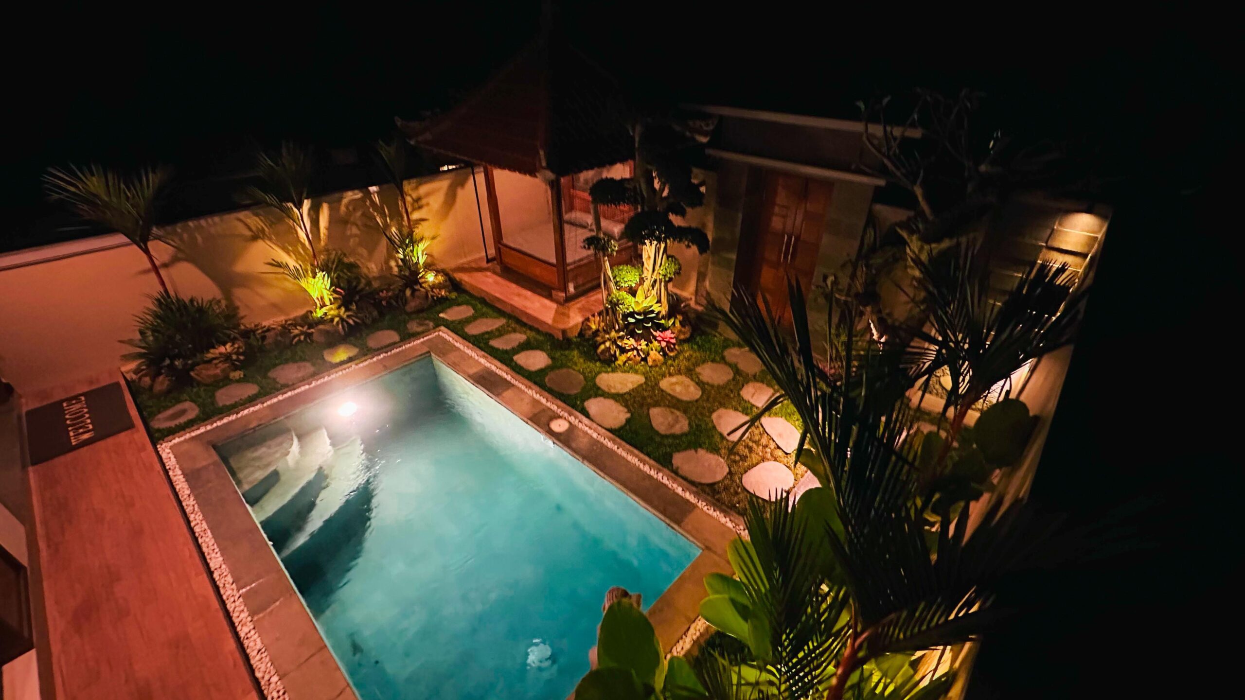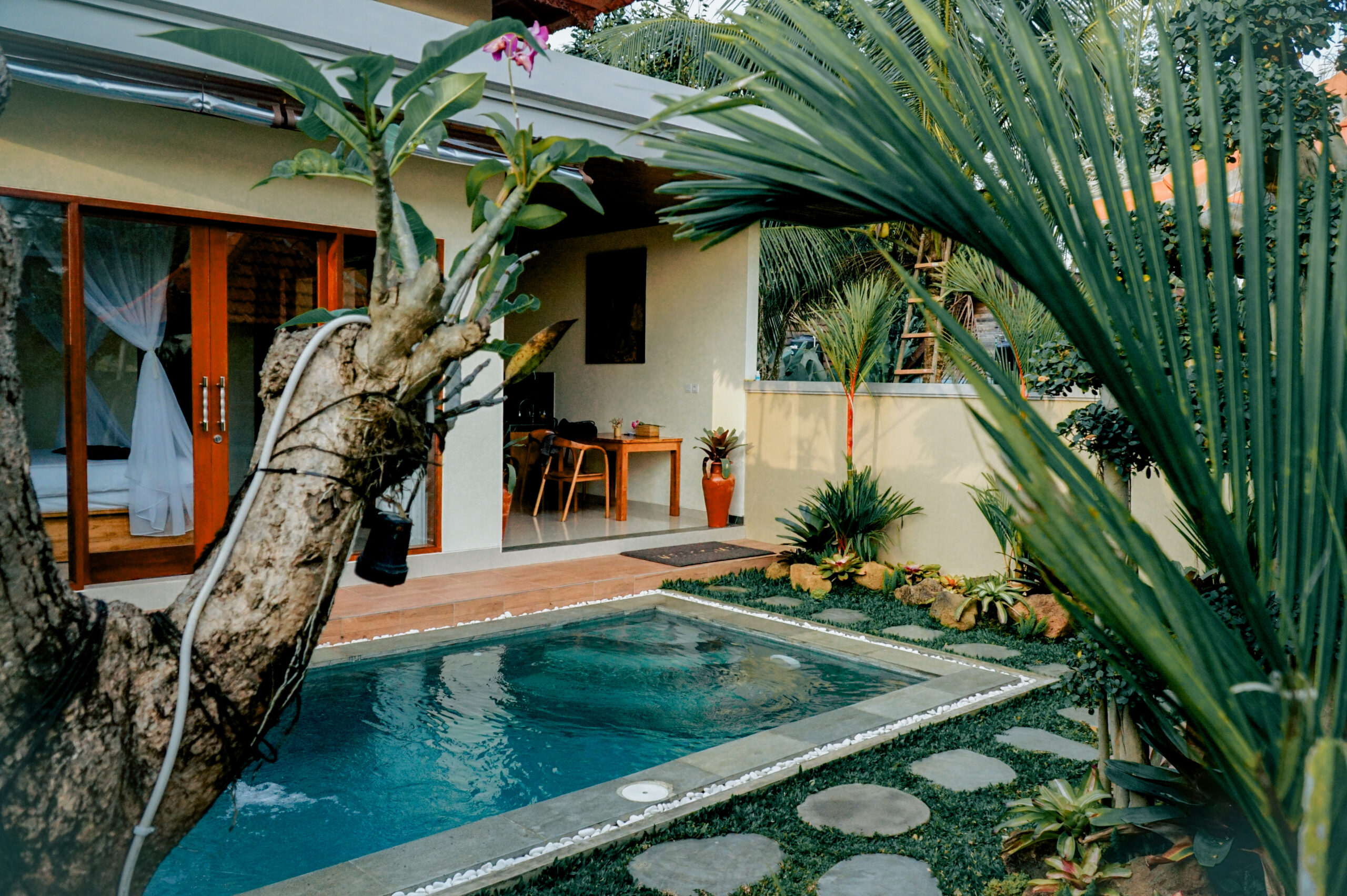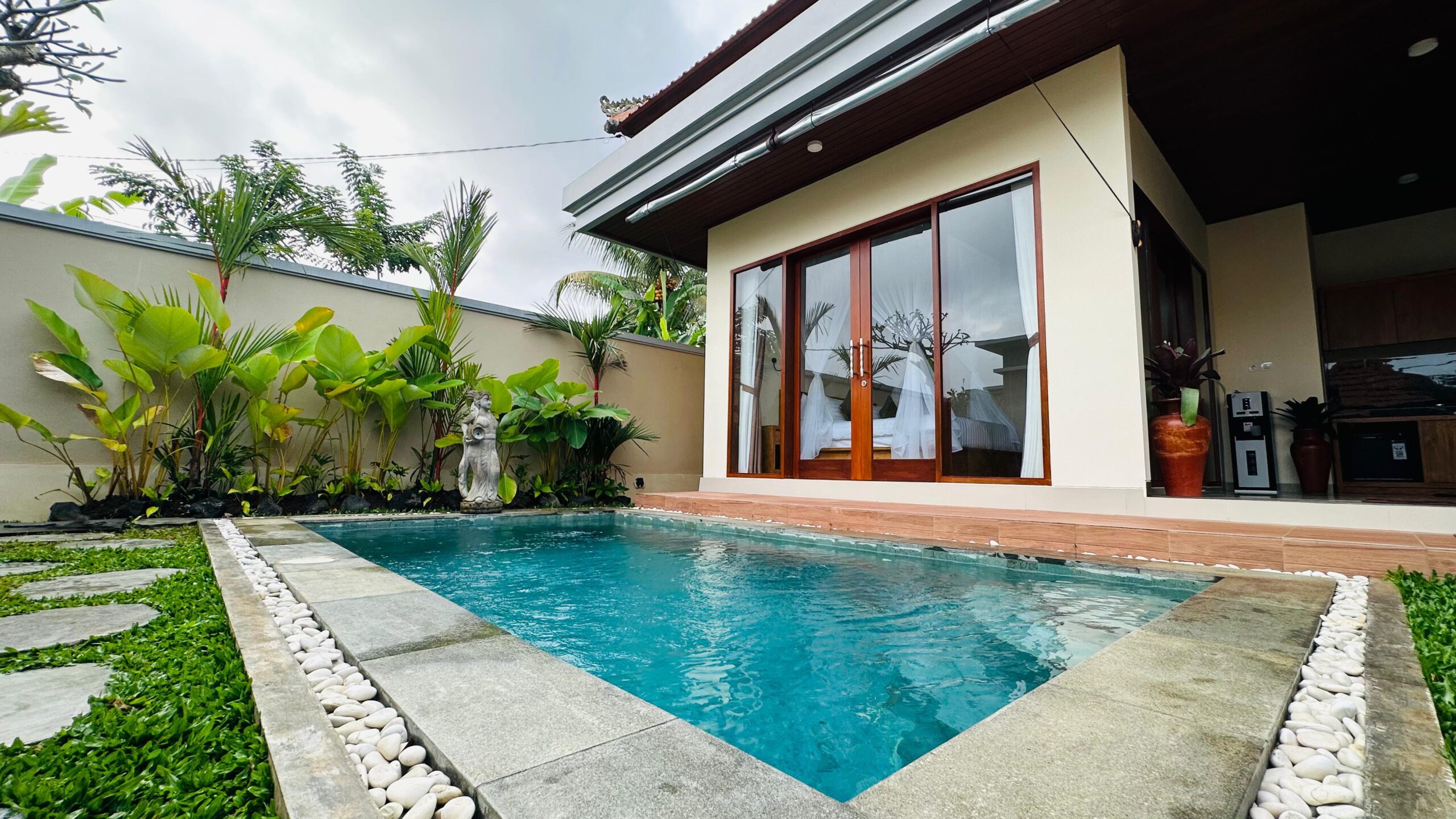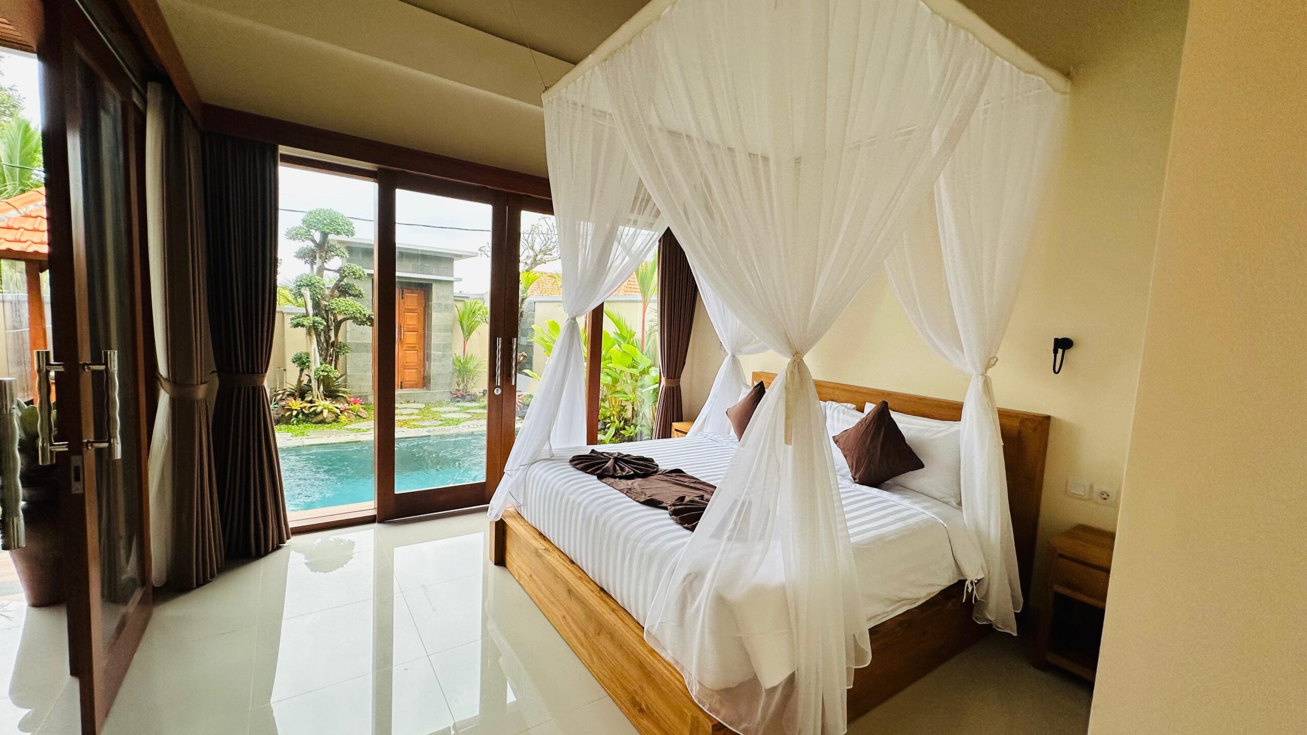 Welcome to Villa Uma Sari, a private one-bedroom villa in peaceful Tampaksiring, Bali. Perfect for a quiet escape, the villa features a cozy bedroom with a queen bed, AC, wardrobe, and desk. The en-suite bathroom includes a shower, bathtub, and hot water. Enjoy a private open kitchen and dining area, plus a pool with gazebo. Located near rice fields, it’s ideal for relaxing stays, nature walks, and a serene Bali experience.