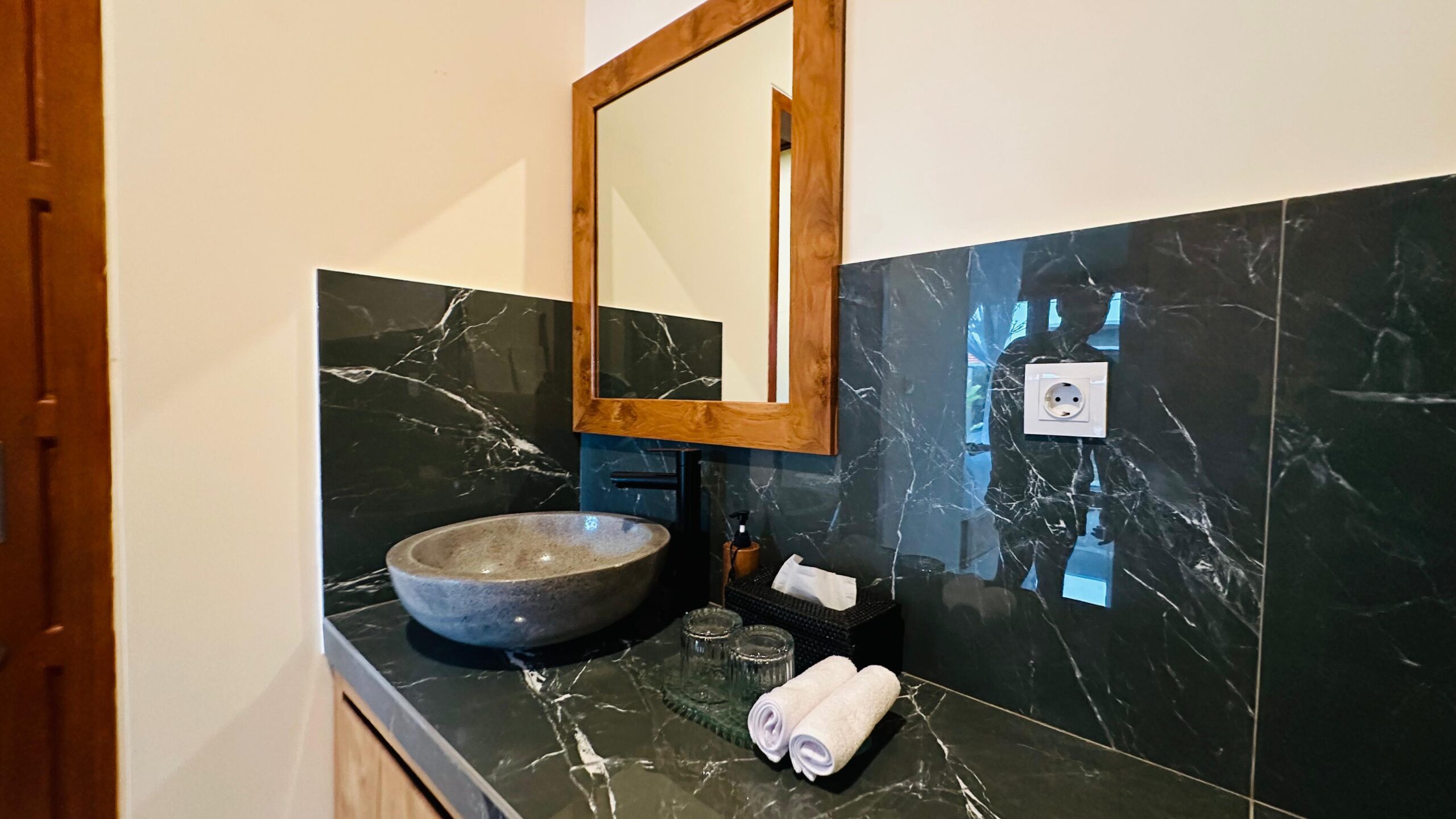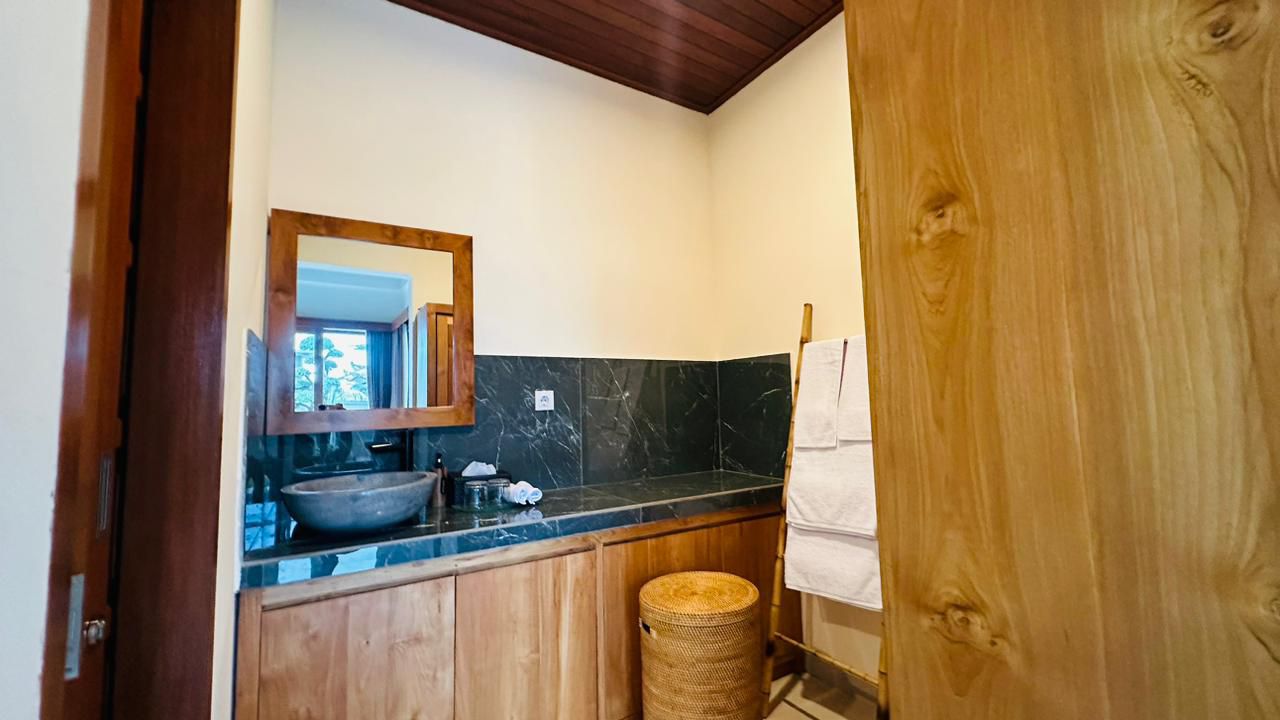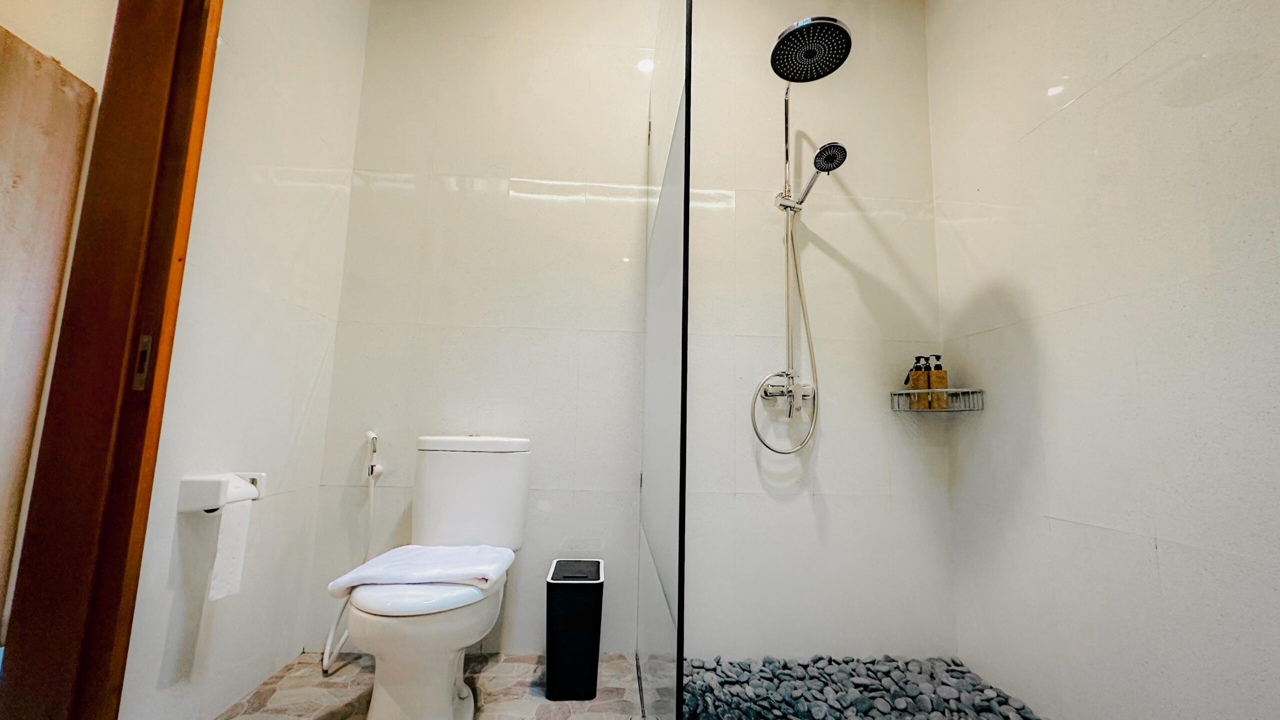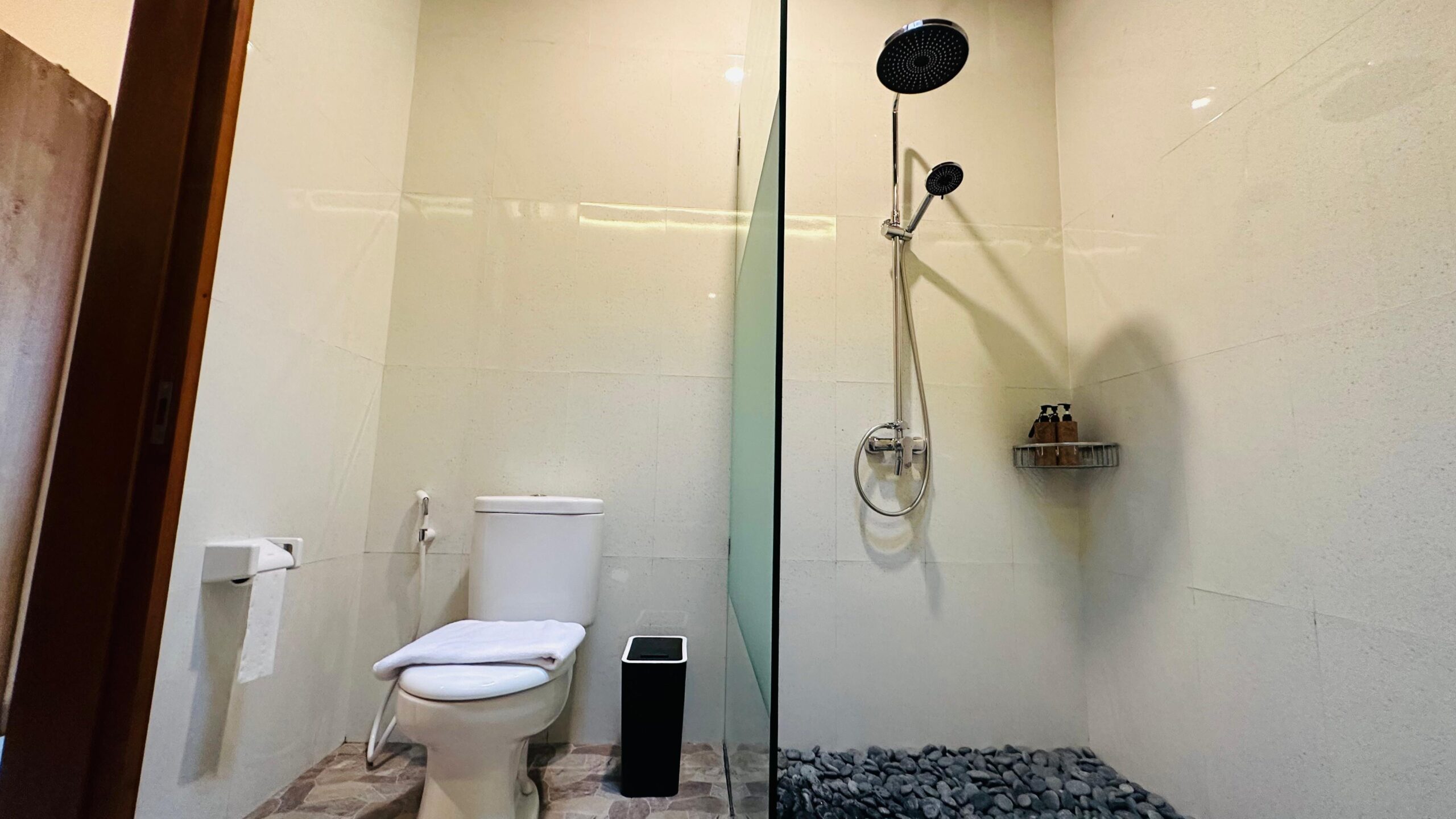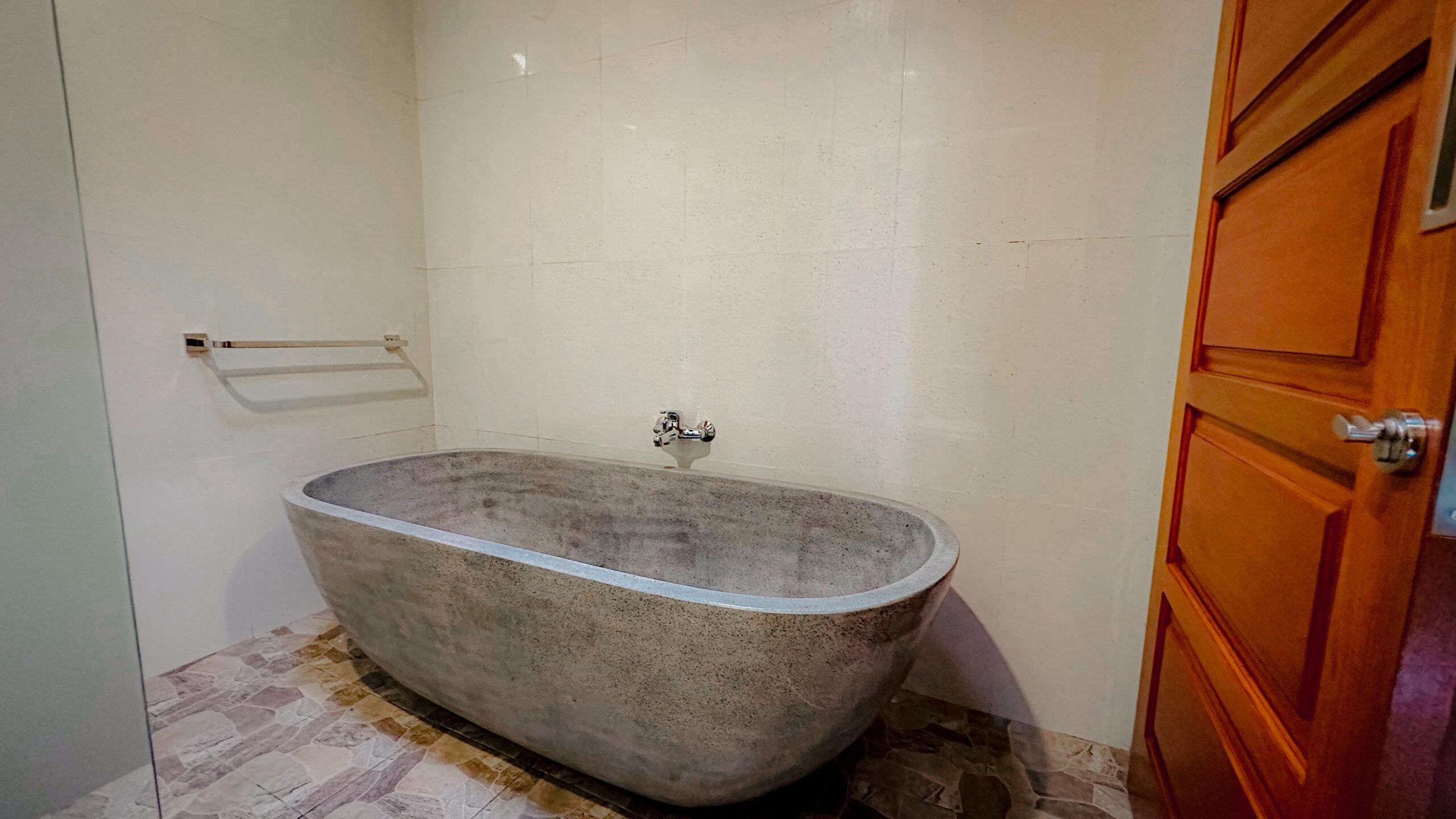 The villa features a cozy bedroom with a comfortable queen-size bed, air conditioning, a wardrobe, and a work desk—ideal for both relaxation and longer stays. The en-suite private bathroom is equipped with a shower and a bathtub, complete with hot water for your comfort.