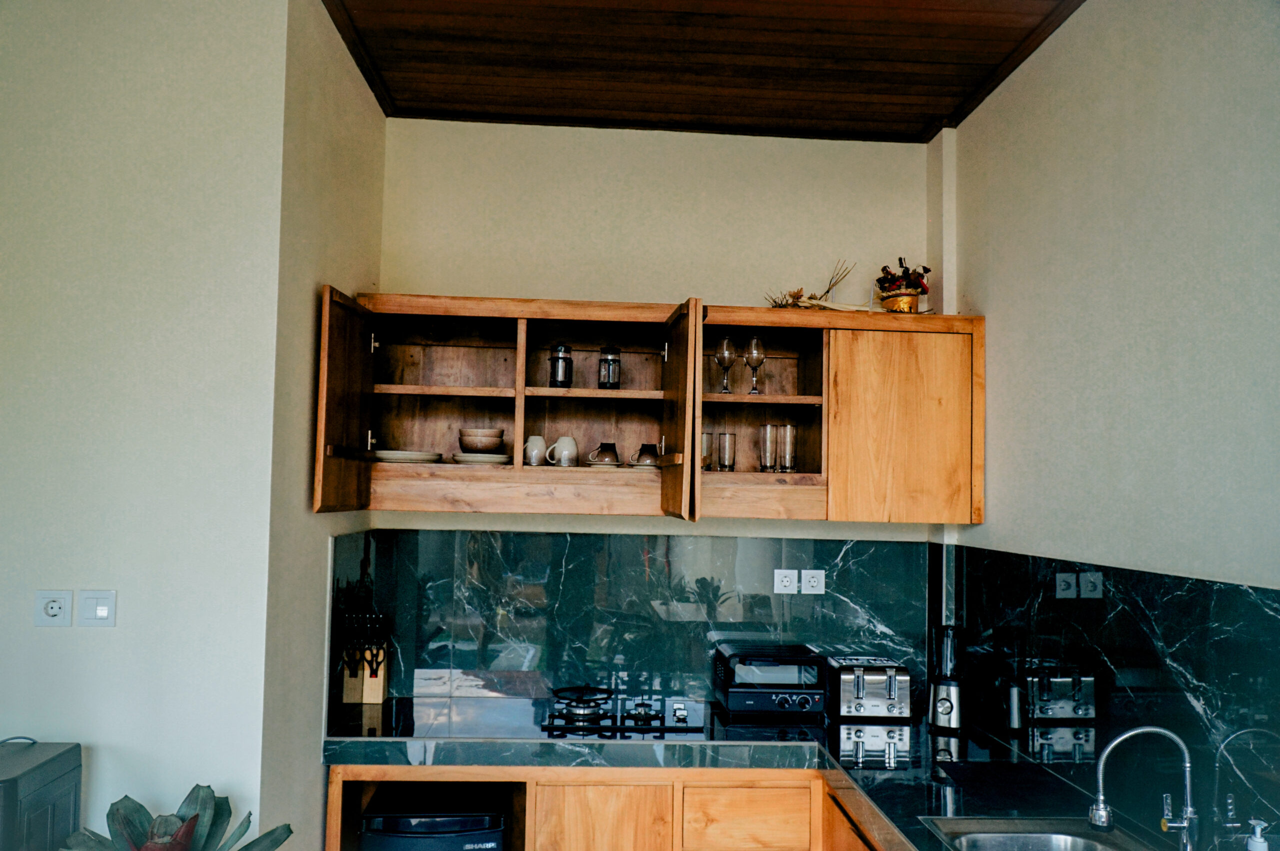 You will also enjoy a private open-style kitchen and dining area, fully equipped with cooking and dining essentials. A small dining table with two chairs creates a simple and intimate space for your meals.