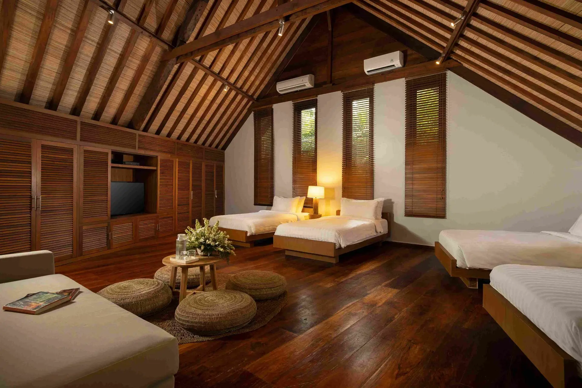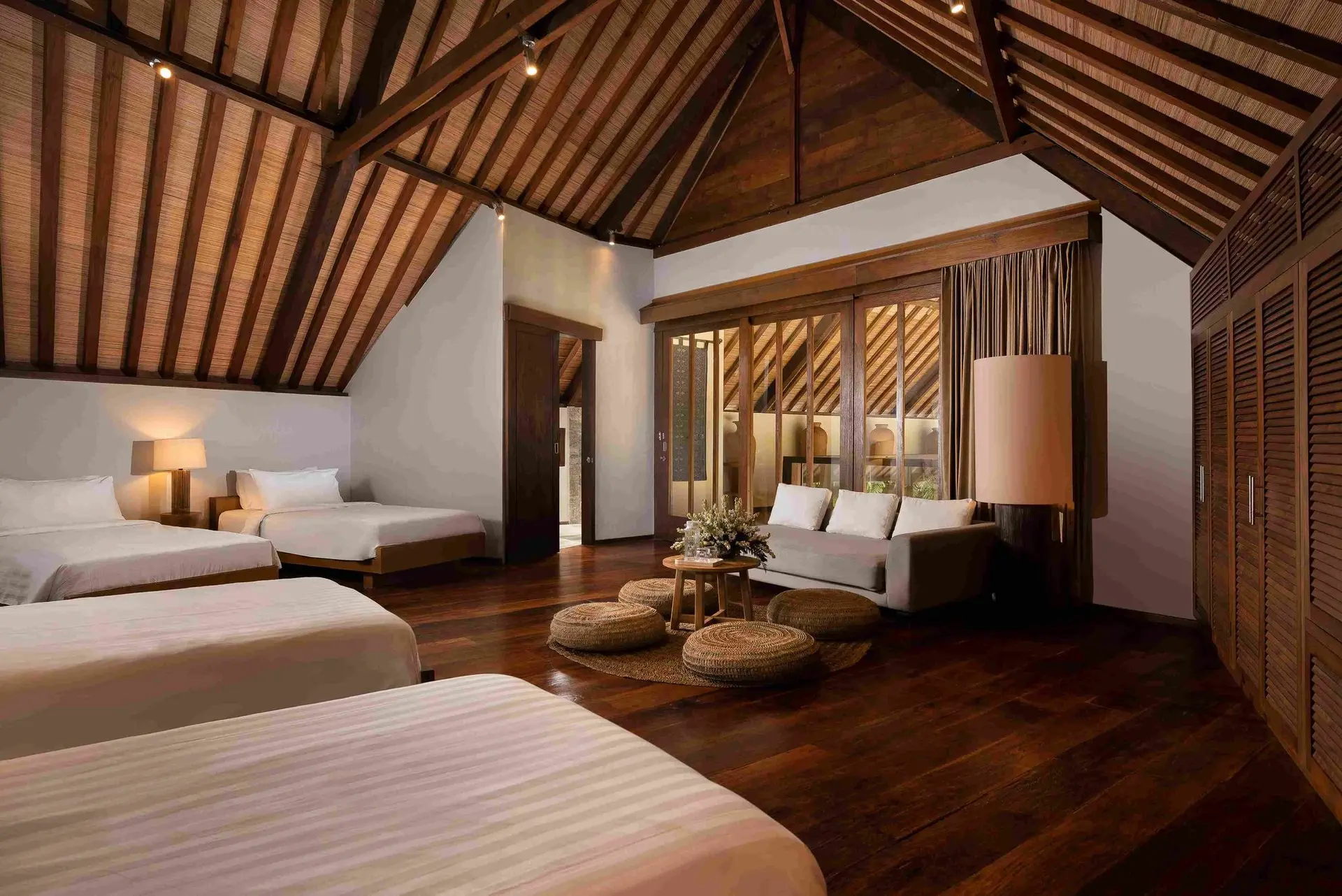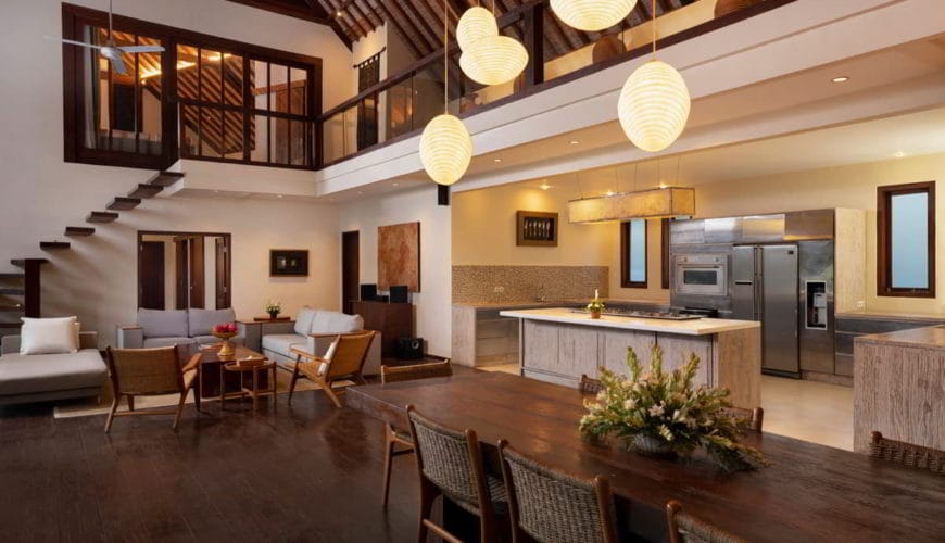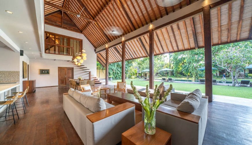 Tucked away in the peaceful rice fields of Kerobokan, Tirtadari Villa offers a luxurious space for large groups. This spacious 7-bedroom villa spans 2800 square meters, welcoming up to 18 guests. It’s ideal for family gatherings, team retreats, or special celebrations. Each bedroom includes a king-size bed, rich wood floors, high thatched ceilings, and large glass doors that open to the gardens. With Joglo-inspired pavilions, the villa blends traditional Balinese design with modern comforts, featuring dark wood panels and tasteful decor for a warm, inviting atmosphere.