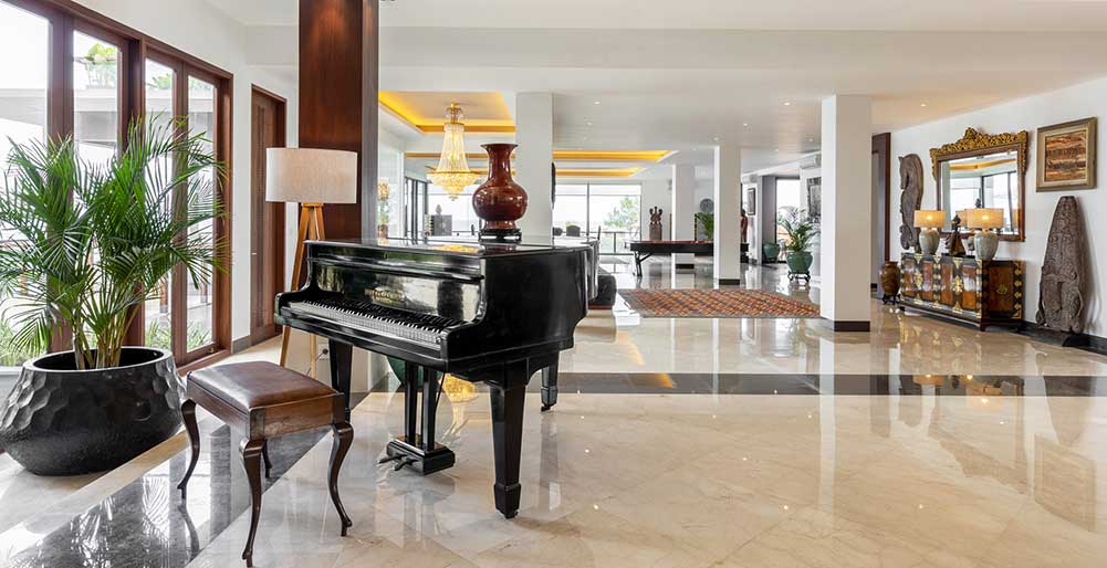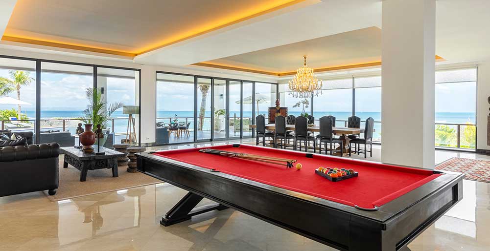 Tirtha Bayu Estate I offers a luxurious getaway perched on a cliff above the serene Cemagi Beach in Bali’s Seseh-Tanah Lot area. Built in 2022, this six-bedroom villa sleeps up to 12 adults, making it perfect for large families or groups of friends. With stunning ocean views and expansive air-conditioned open-plan living spaces, Tirtha Bayu Villa I is designed for comfort and relaxation. The villa features a private 14-meter infinity swimming pool, gym facilities, a home theater, and entertainment options like a pool table and a baby grand piano.