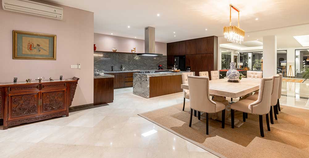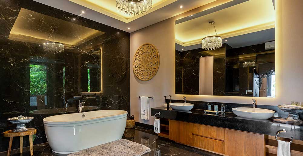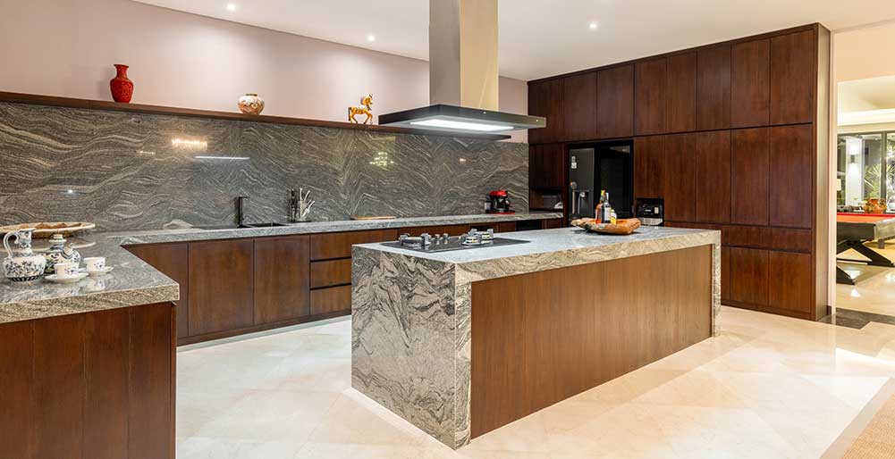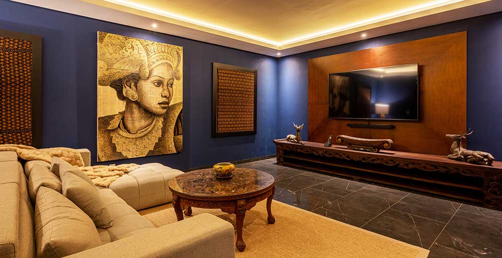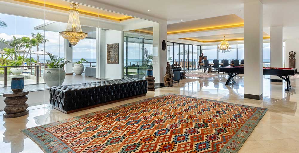 Each of the six bedrooms has its own spa-style ensuite bathroom, with two expansive master suites offering ocean views and walk-in closets. The villa blends contemporary architecture with traditional Balinese design, highlighted by hand-picked antiques and artwork. The tranquil surroundings are perfect for unwinding or exploring local rice fields, or you can head to nearby Pura Gede Luhur Batu Ngaus for a stunning sunset view. The villa is only 9 kilometers from Echo Beach, where you can enjoy vibrant beach clubs and cafes.
