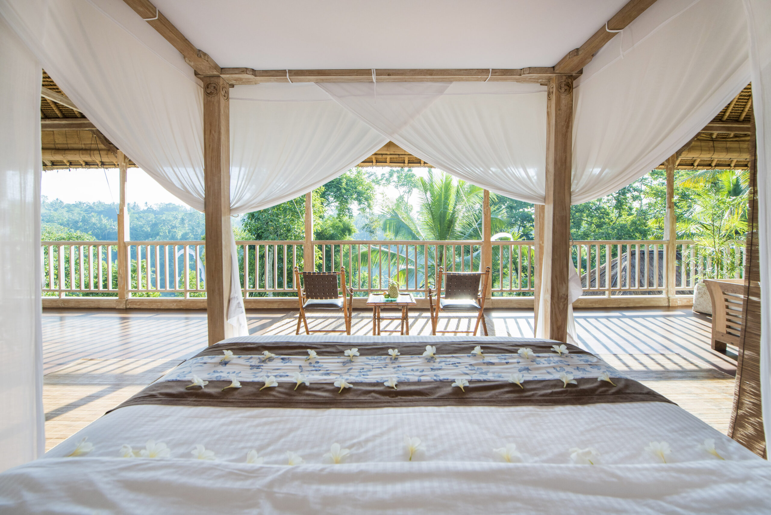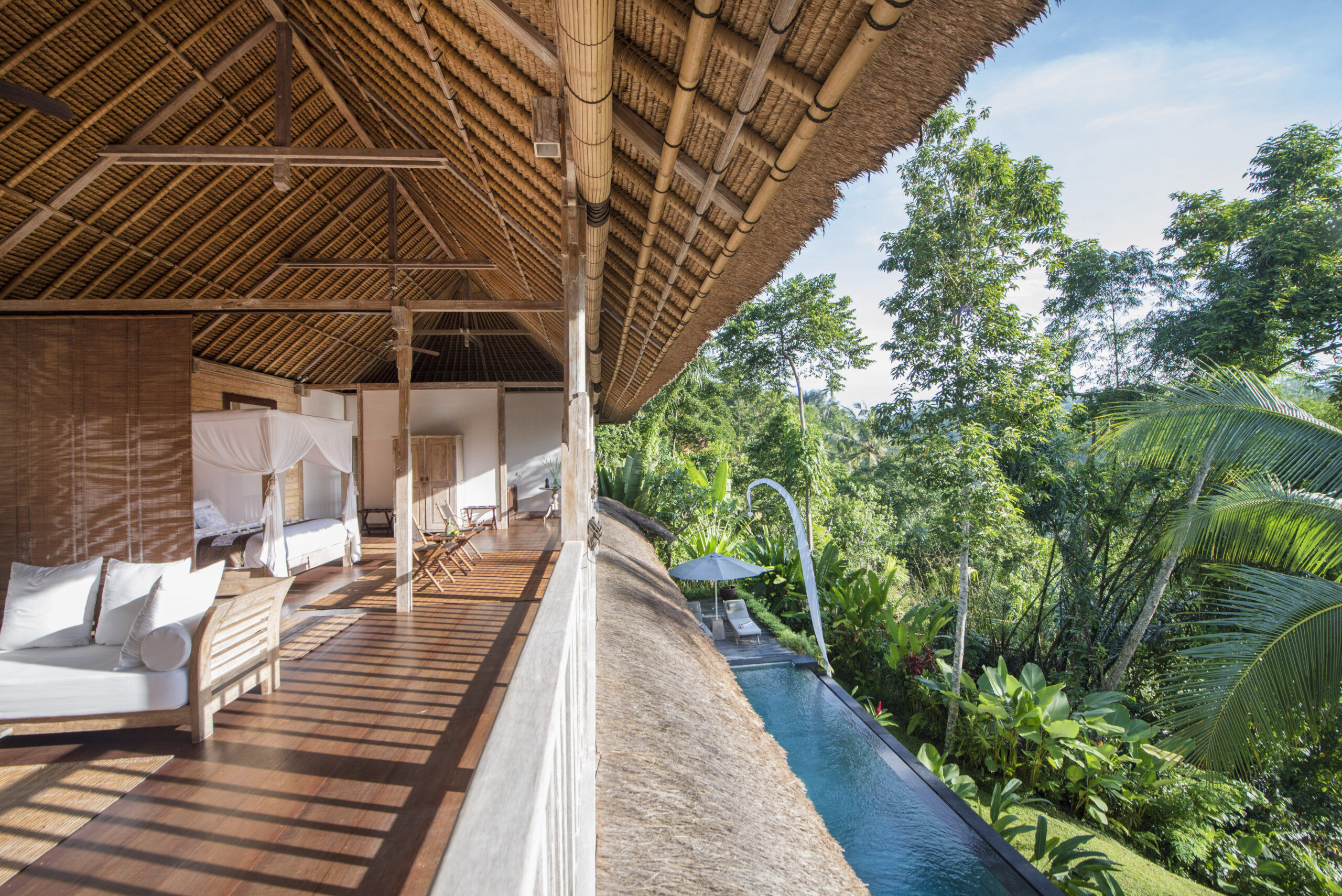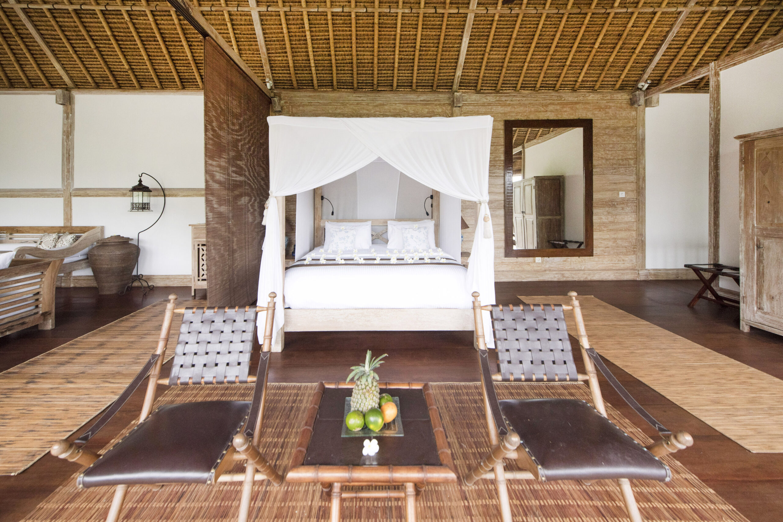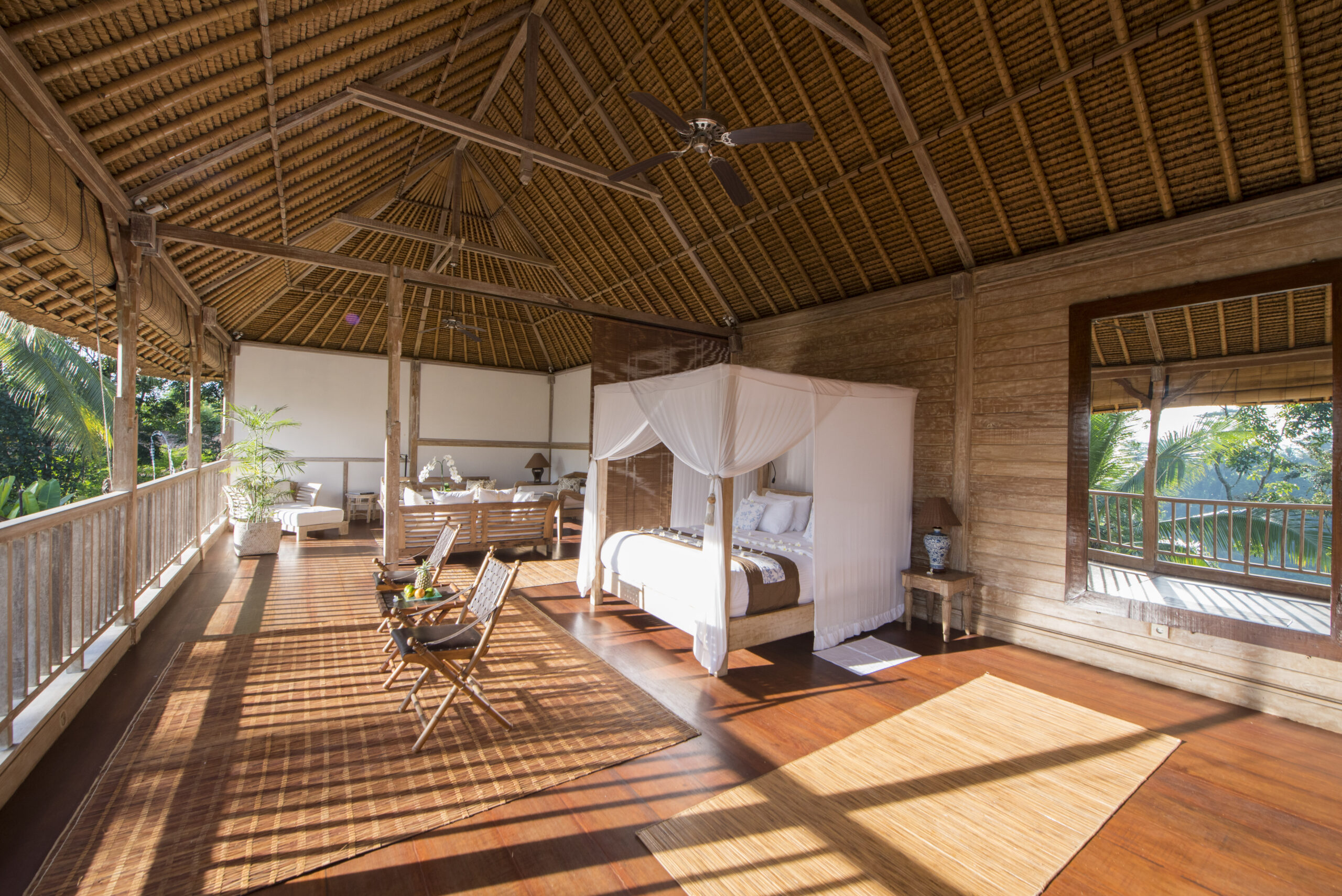 Upstairs, the spacious bedroom suite features views of the jungle valley, a four-poster bed, an antique daybed, and a balcony bath. It also includes a wardrobe with safes, fresh kimonos, and a rain shower.