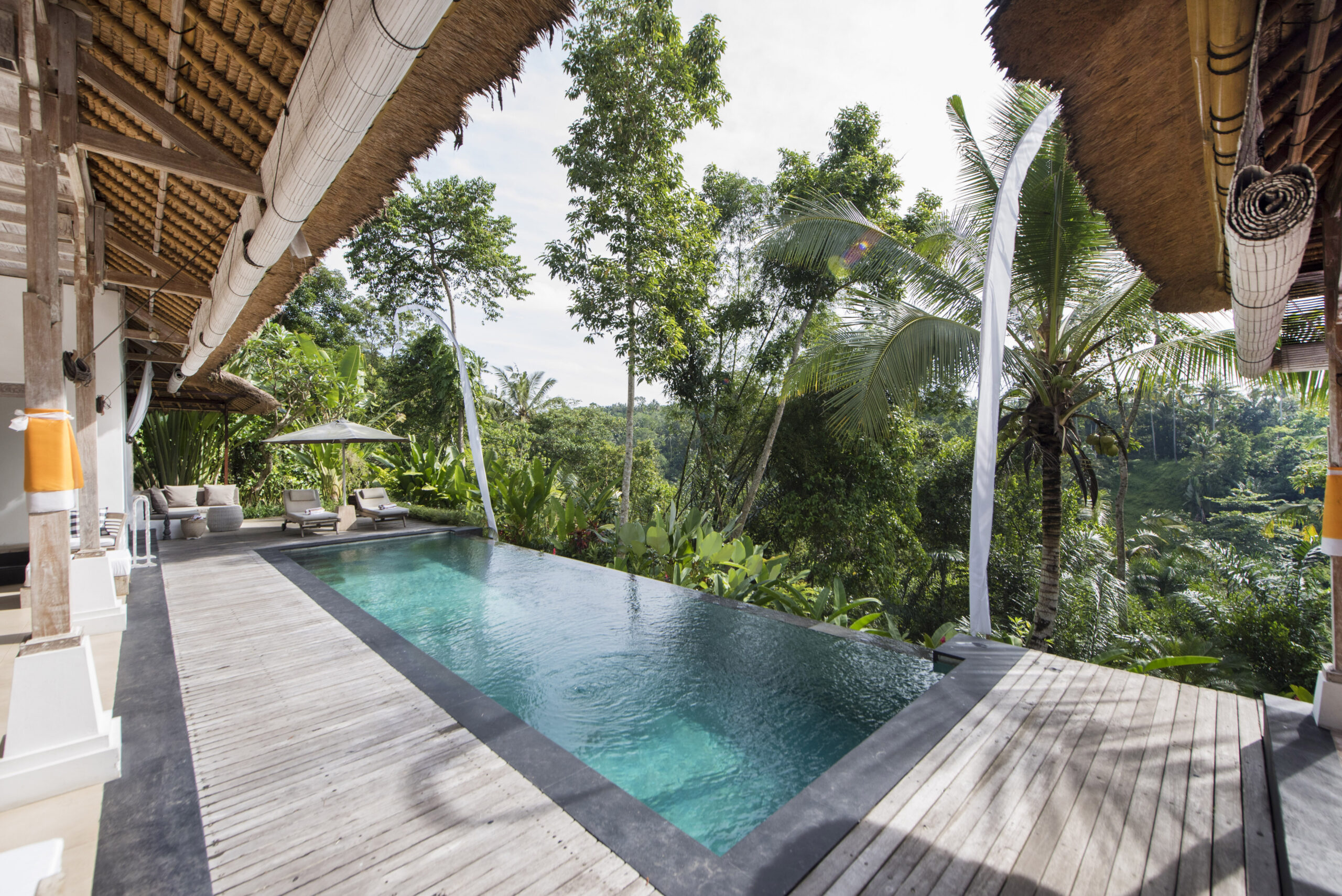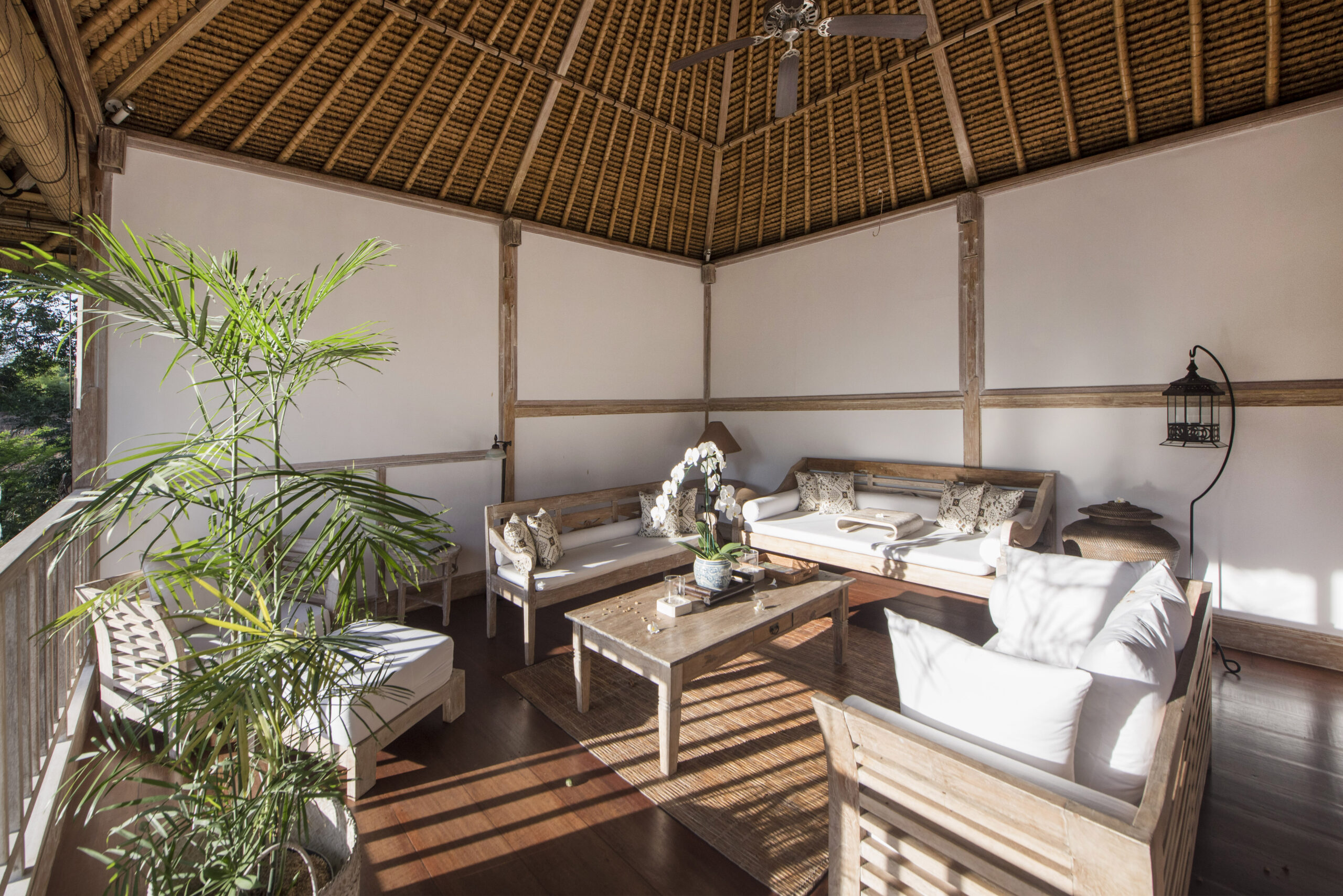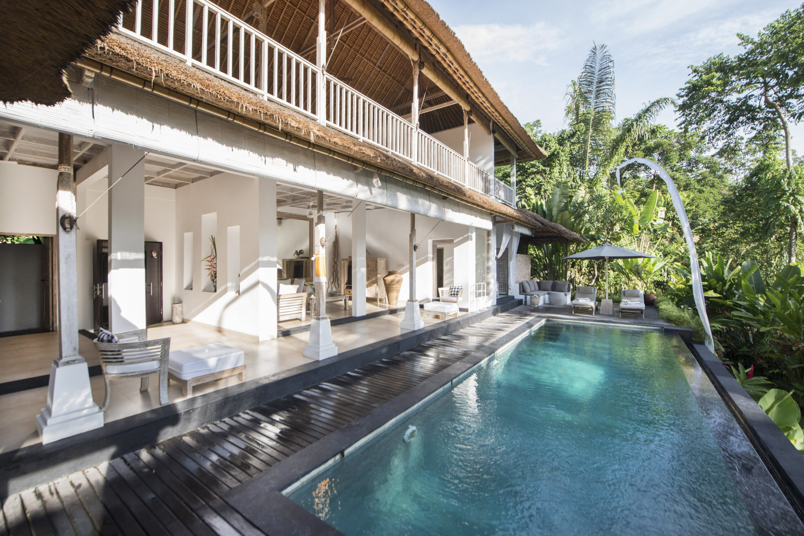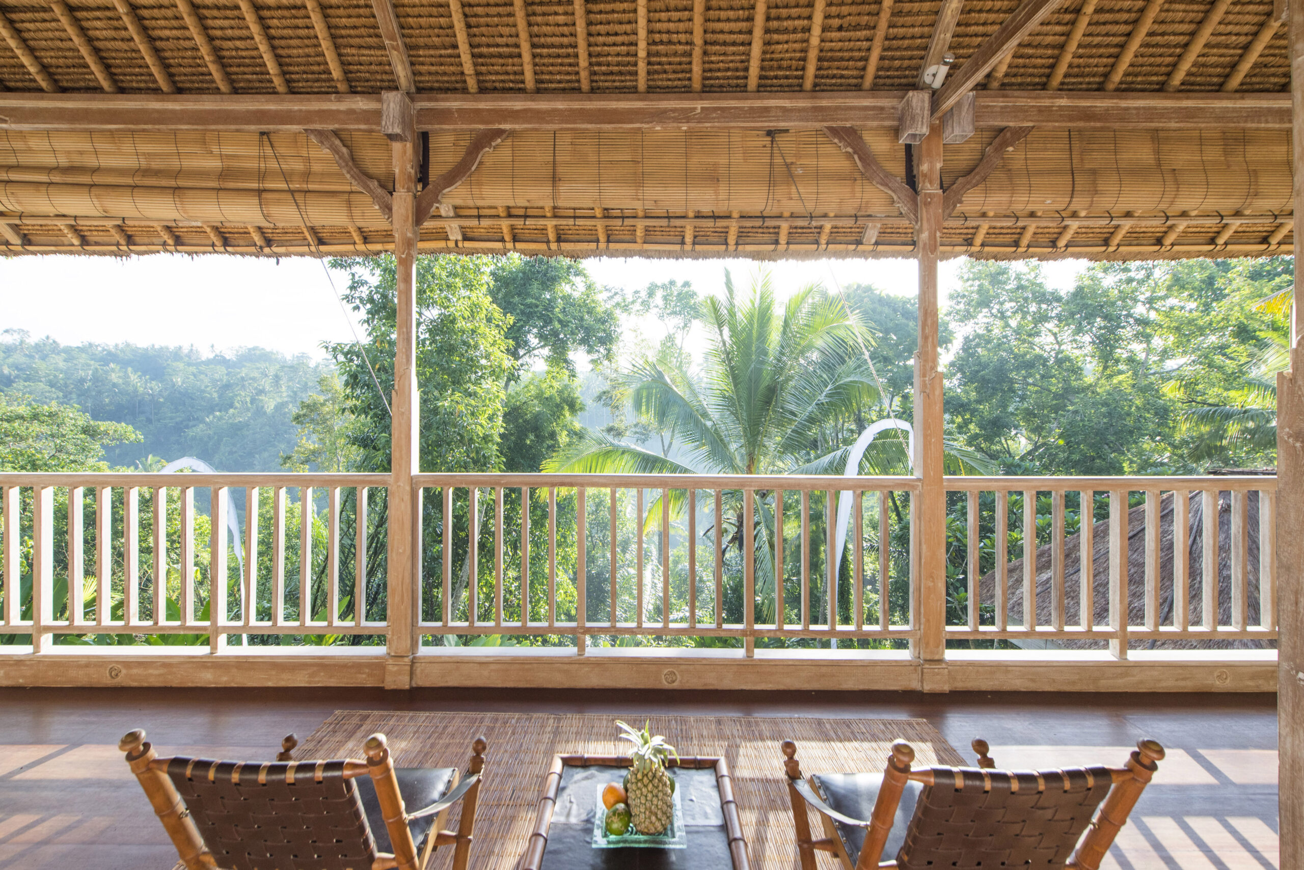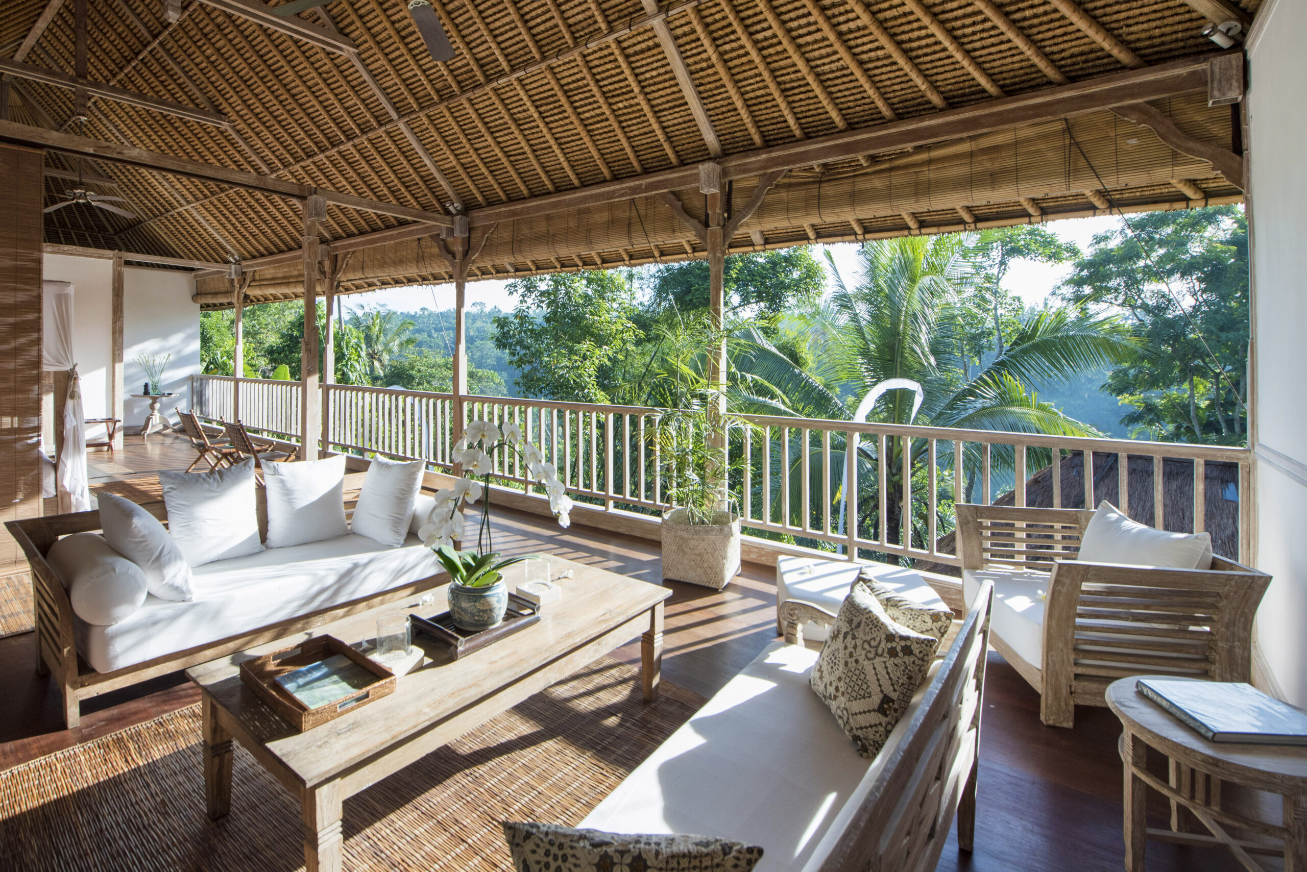 Upstairs, the spacious bedroom suite features views of the jungle valley, a four-poster bed, an antique daybed, and a balcony bath. It also includes a wardrobe with safes, fresh kimonos, and a rain shower.
