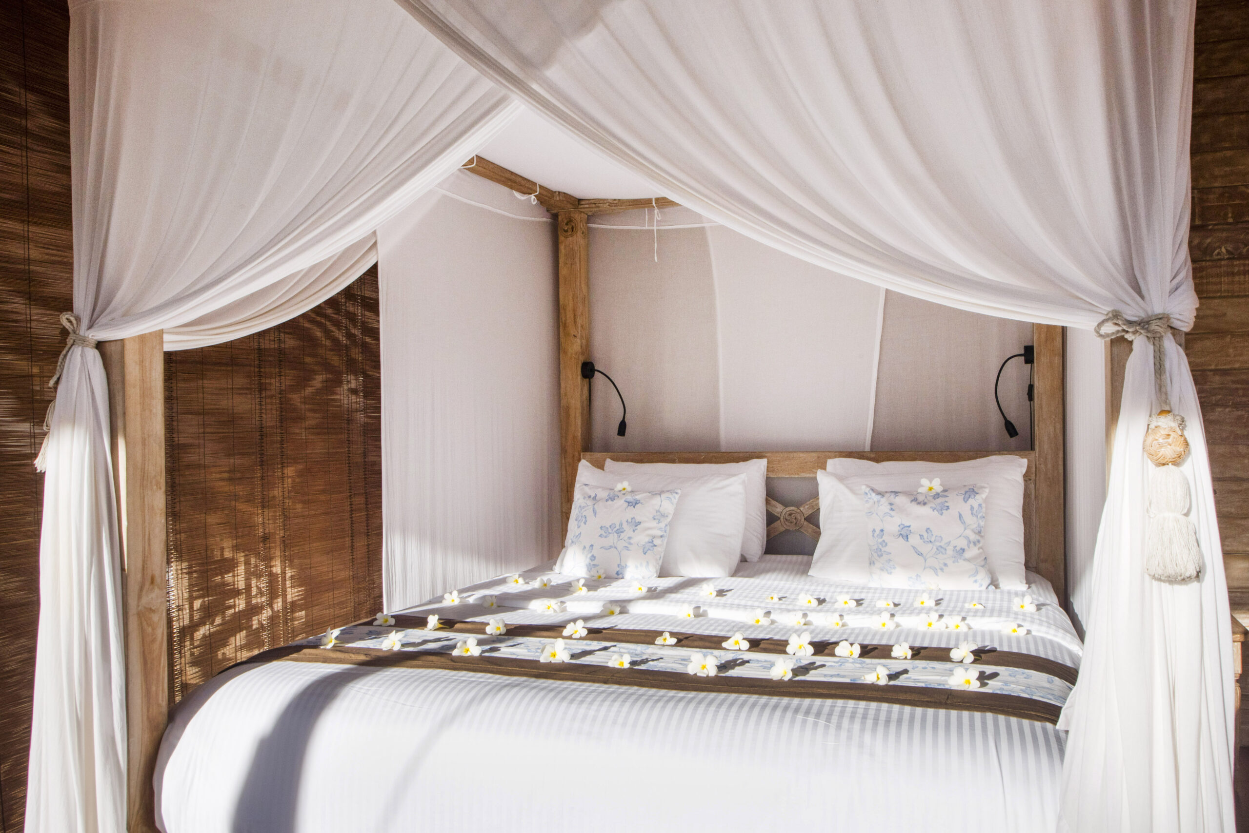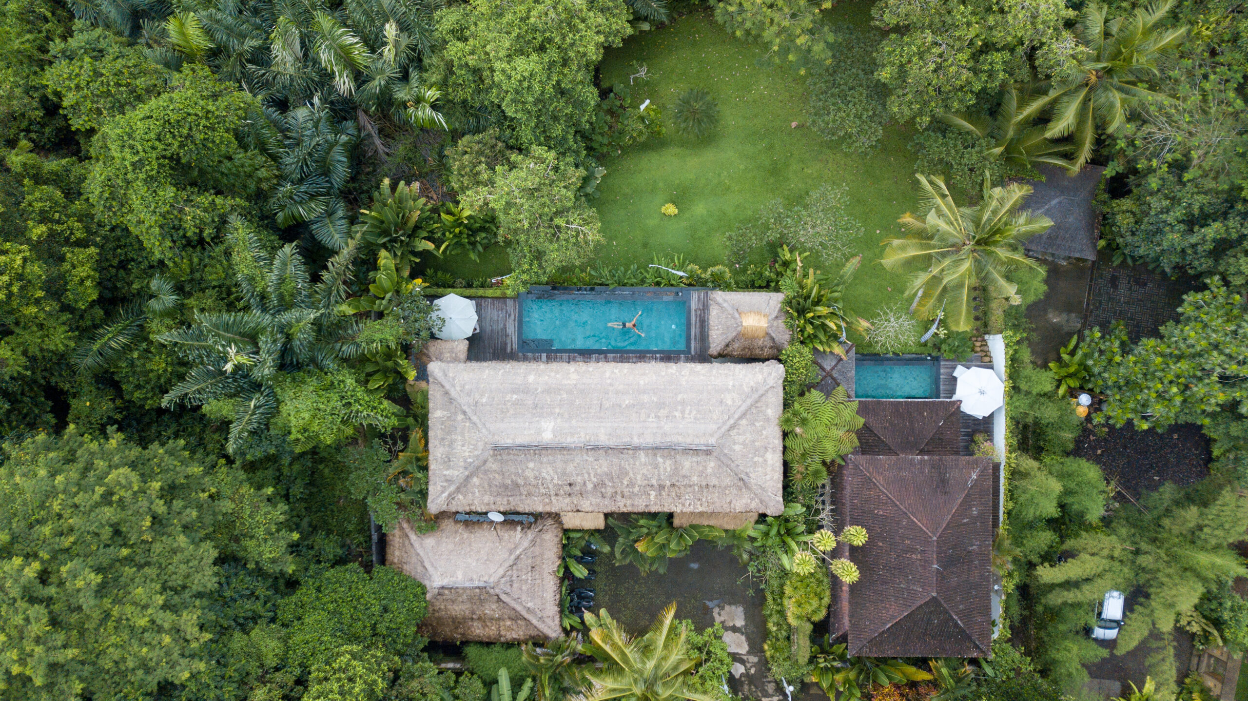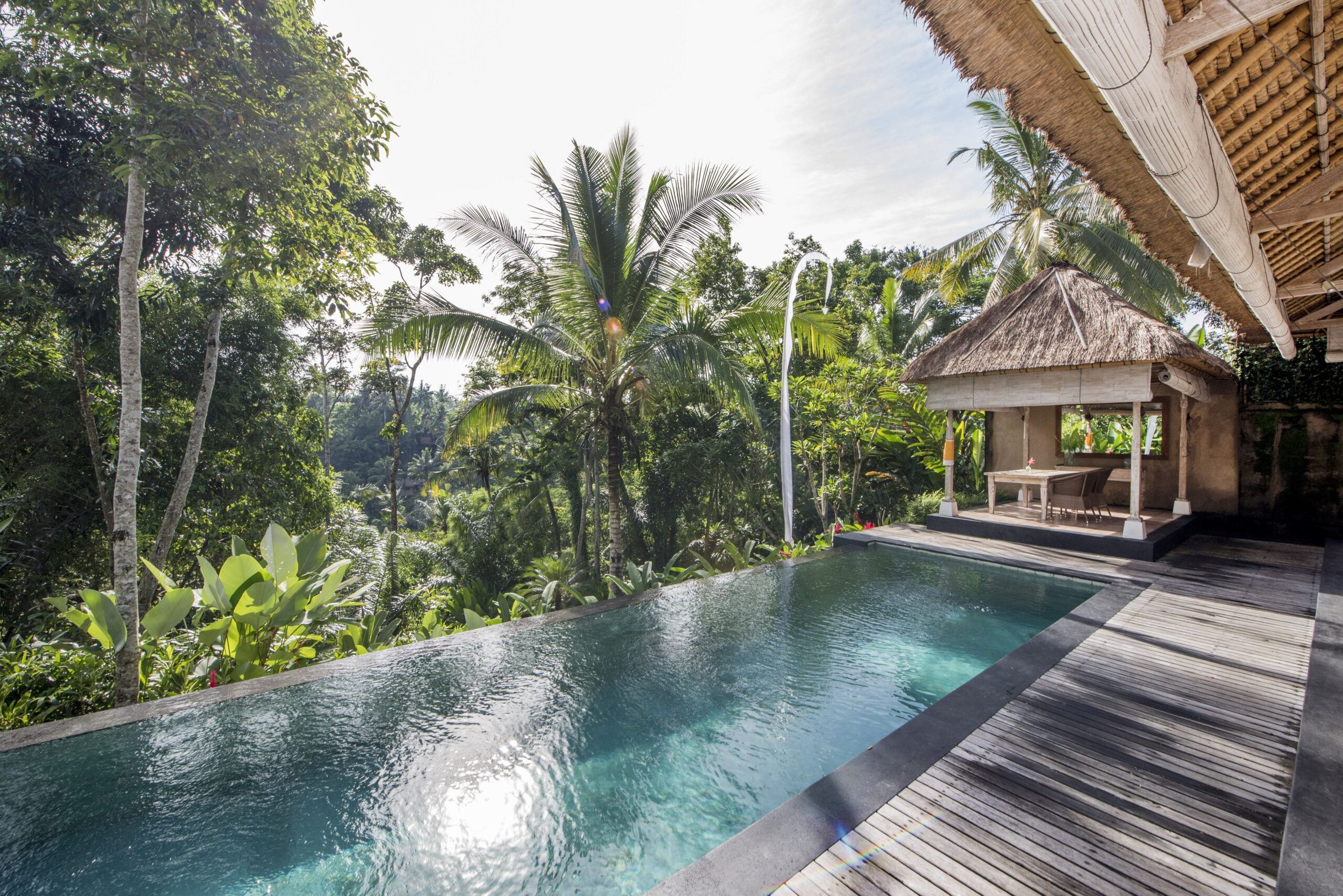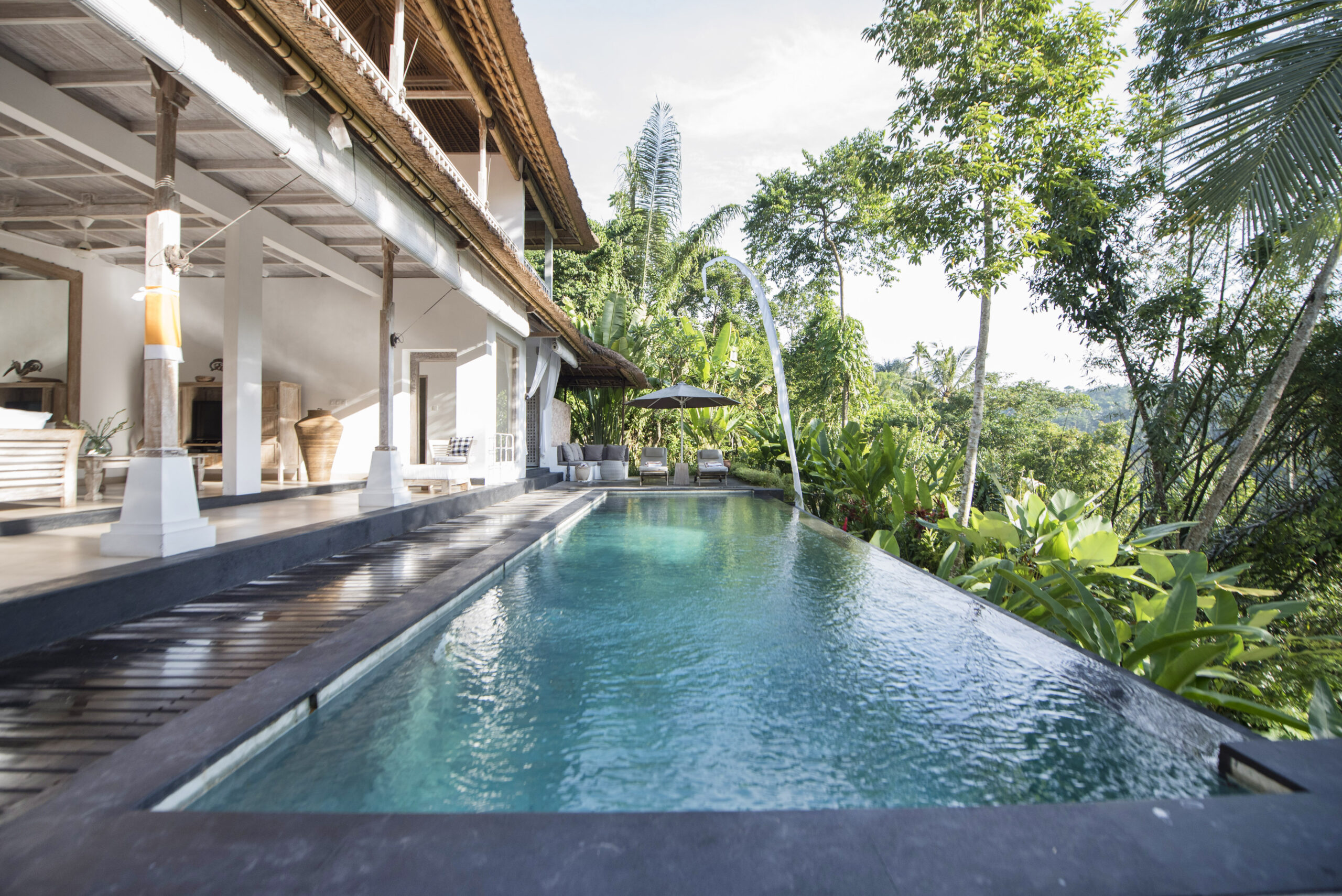 Upstairs, the spacious bedroom suite features views of the jungle valley, a four-poster bed, an antique daybed, and a balcony bath. It also includes a wardrobe with safes, fresh kimonos, and a rain shower.
