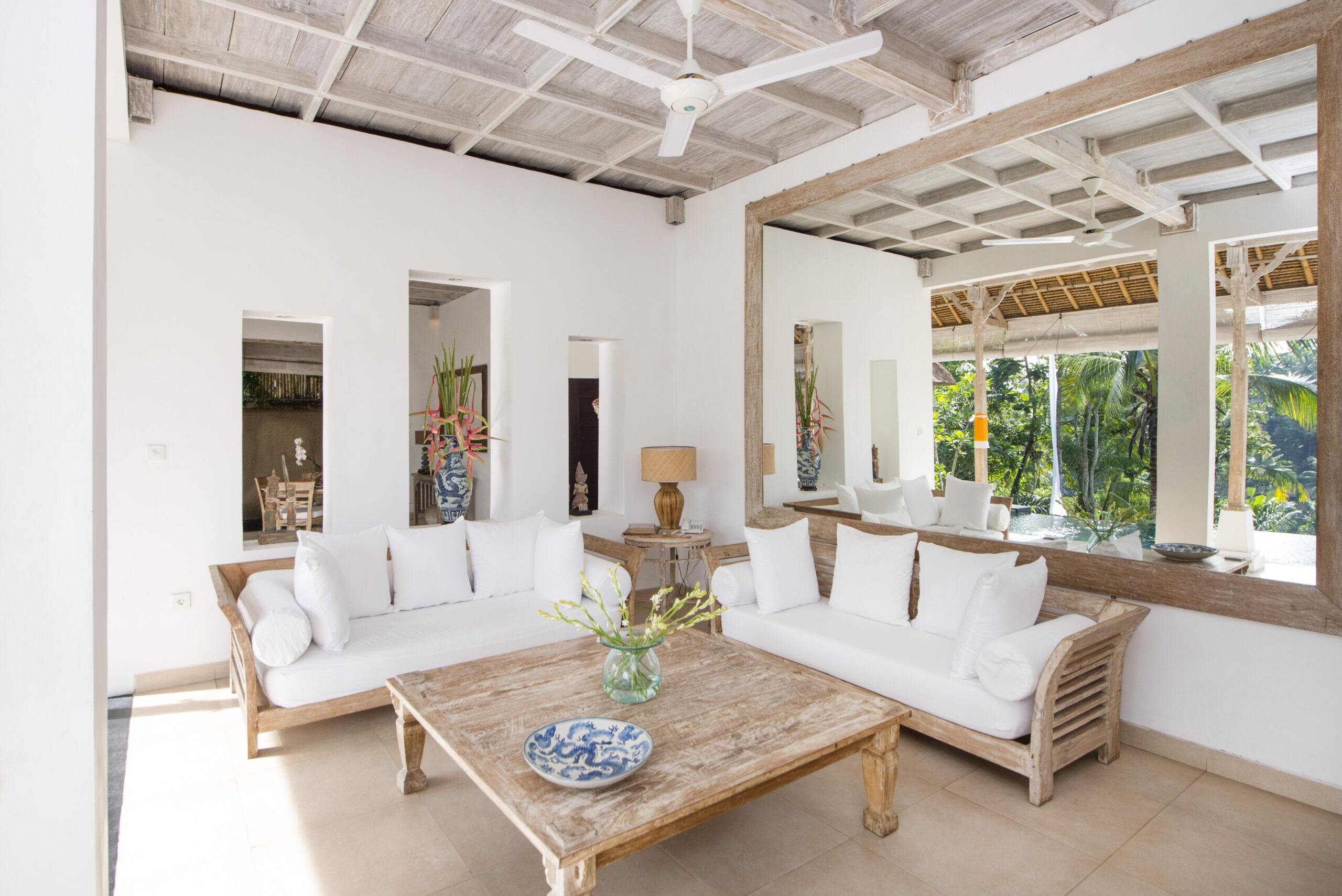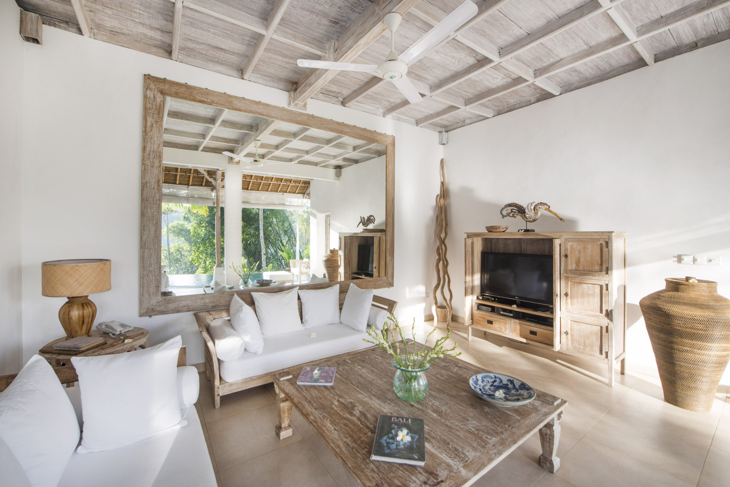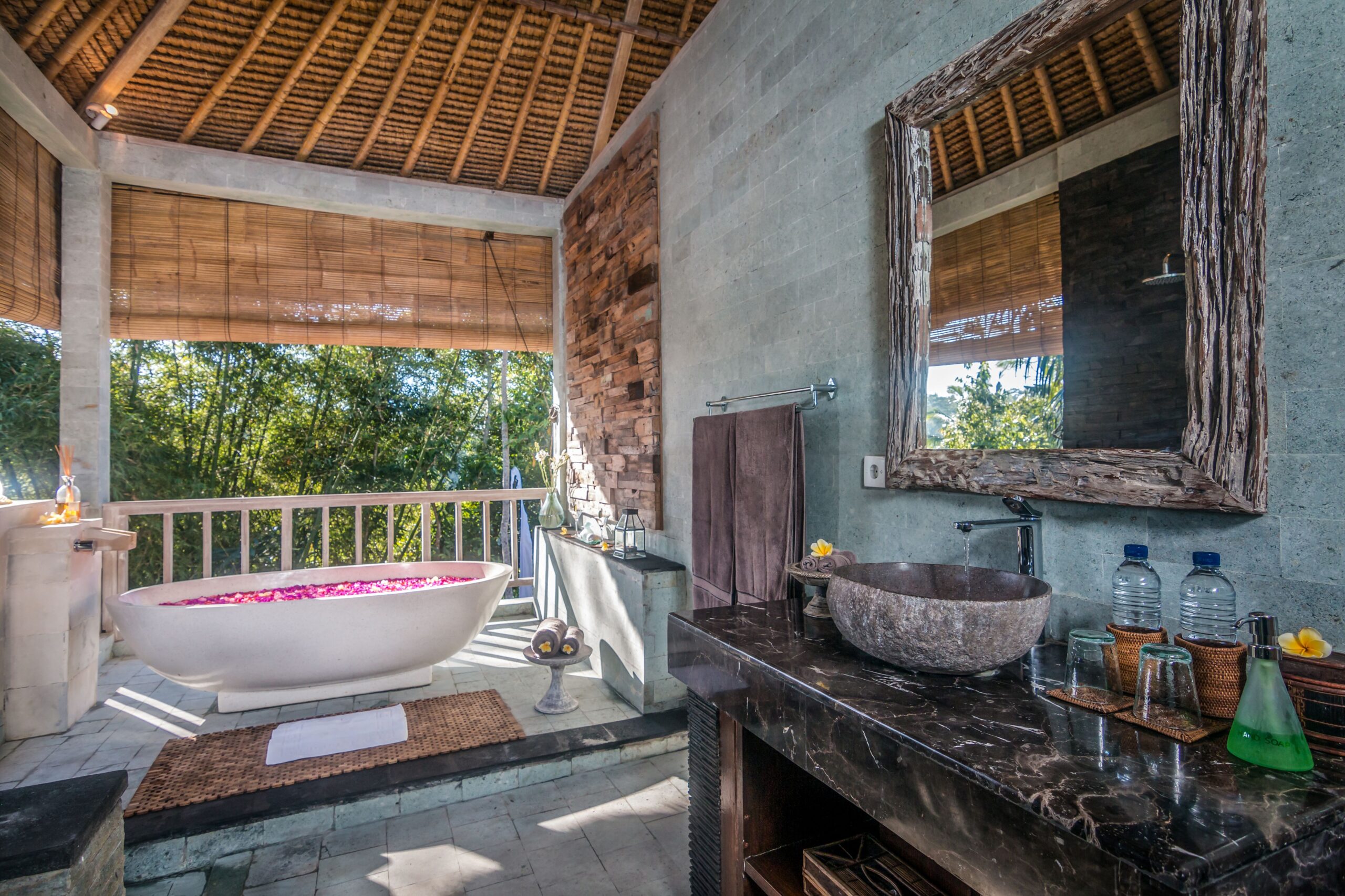 The large living room is designed with traditional thatched roofs and showcases stunning views of the surrounding area. The wooden interior is decorated with traditional artifacts. A round dining table is perfect for romantic meals. The lounge area has a large mirror reflecting the jungle valley, along with cozy sofas, a wooden closet, a Smart TV, and books. At night, bamboo shutters can be closed for a cozy movie experience. There’s also an additional bathroom downstairs featuring a luxurious outdoor stone bathtub, rain shower, terrazzo floor, greenery, and candles.