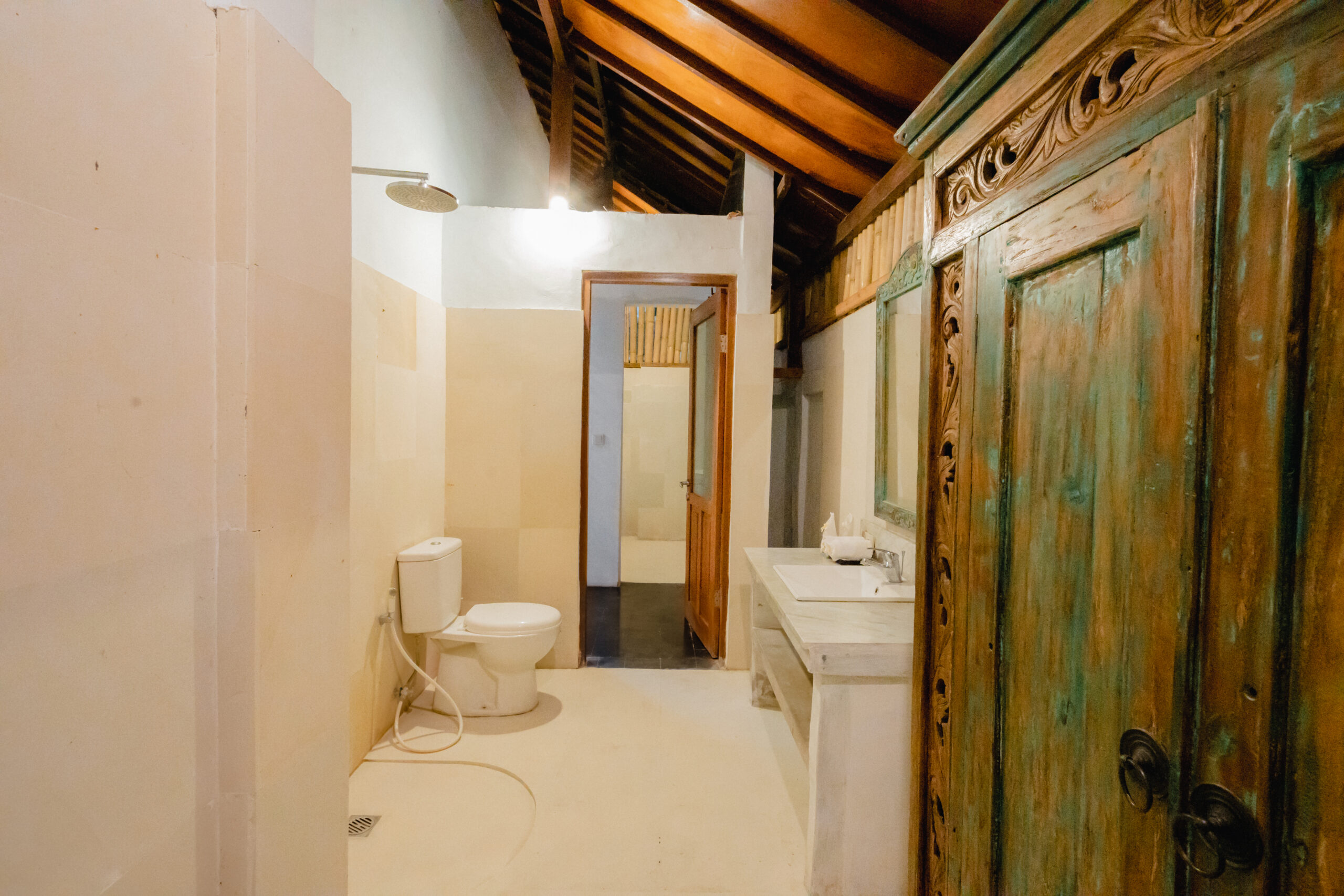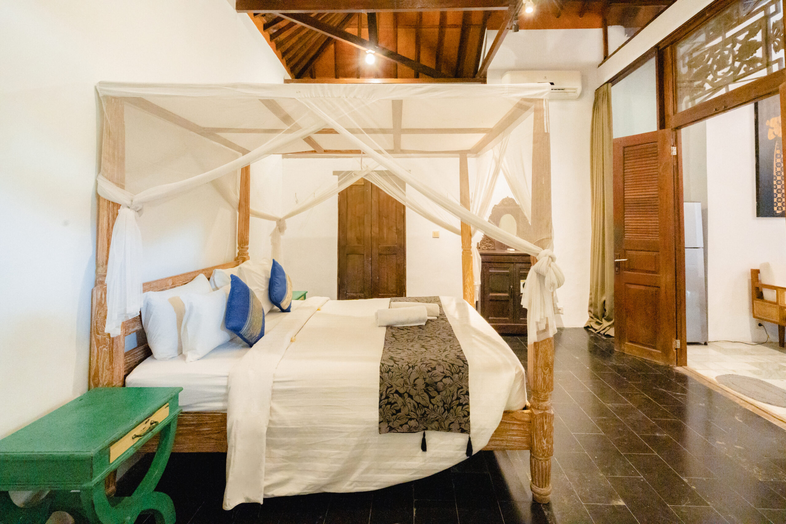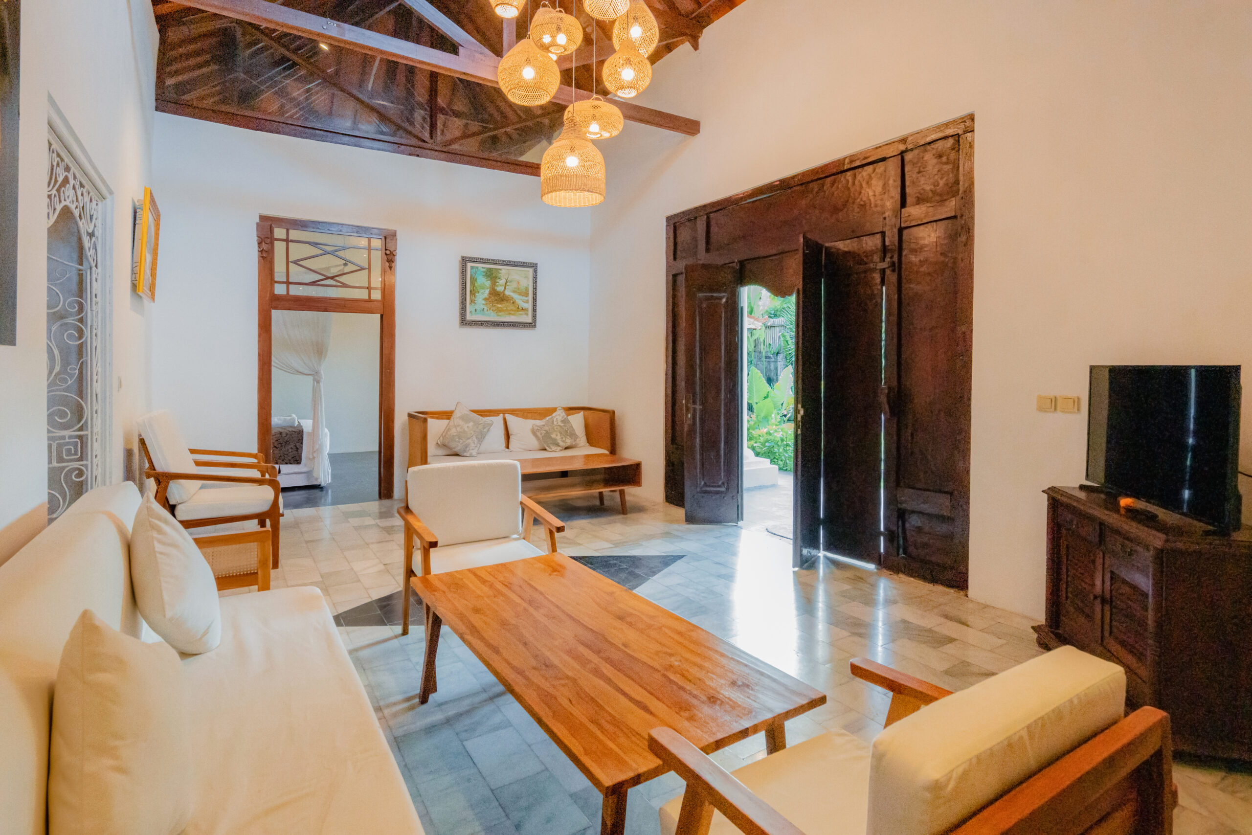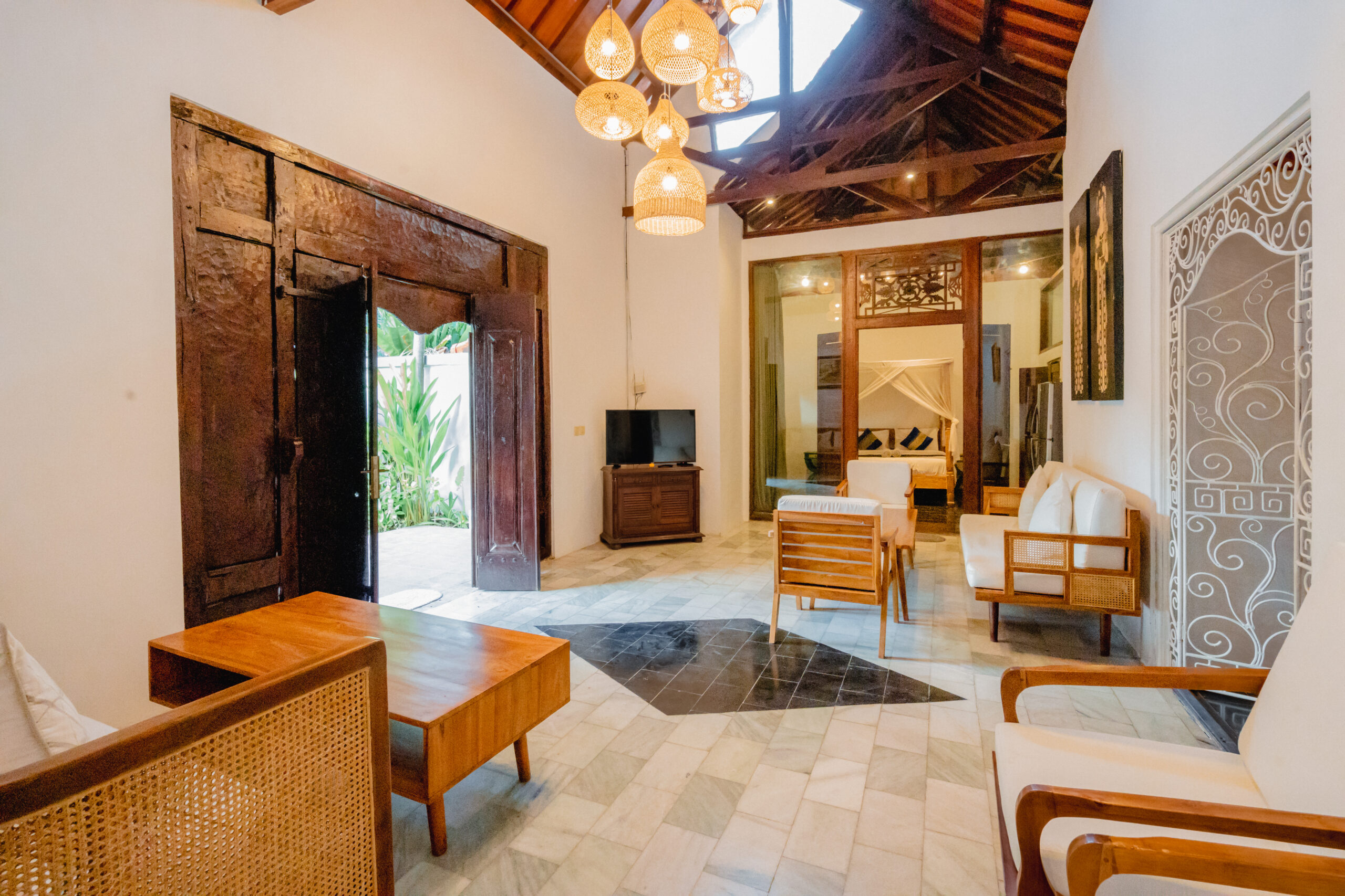 Villa Etnik Seminyak offers a captivating experience, blending traditional Javanese Joglo design with Balinese elegance. This five-bedroom villa features a spacious garden with a cozy atmosphere, perfect for those exploring Seminyak’s vibrant nightlife and dining scene.